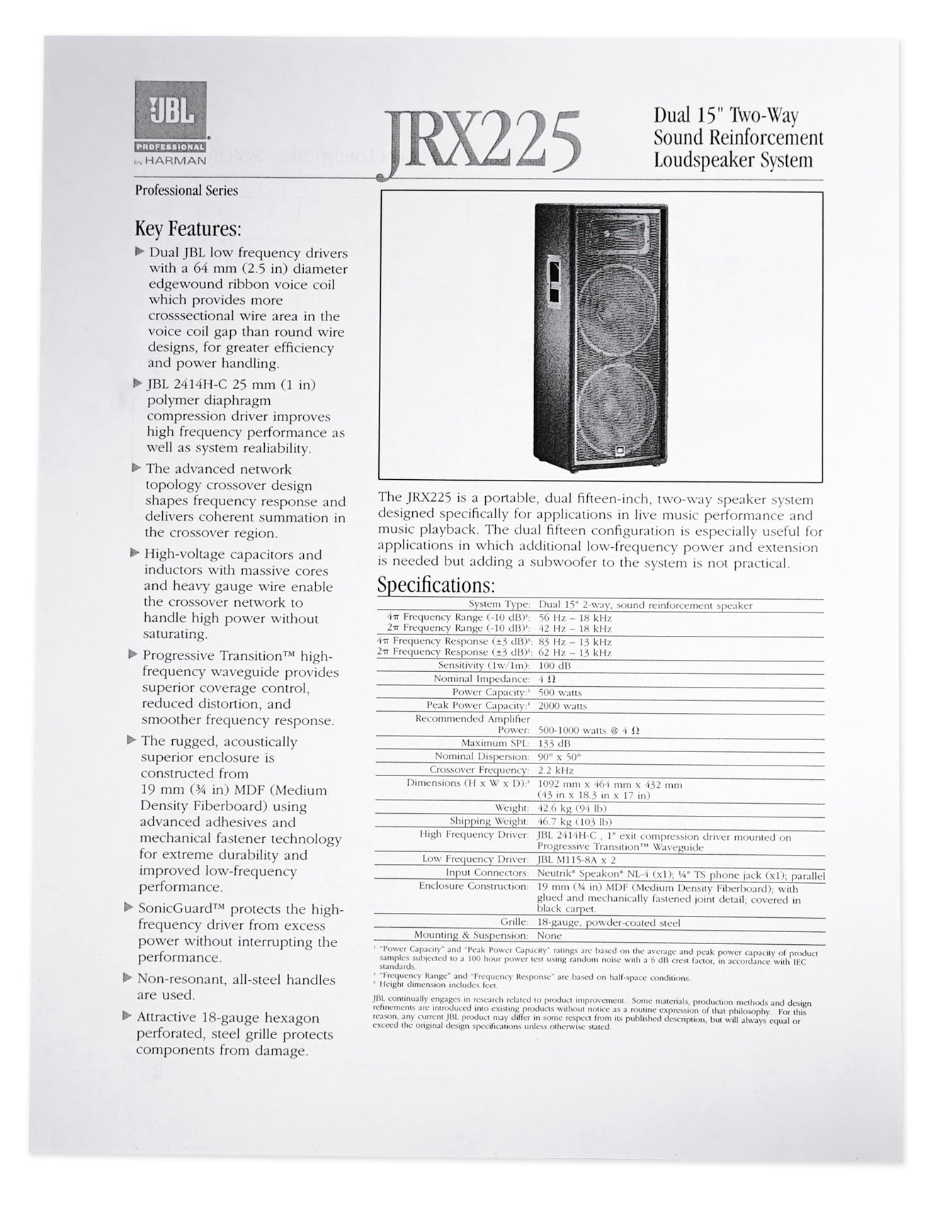 - Dual JBL low frequency drivers with a 64 mm (2.5 in) diameter edgewound ribbon voice coil for greater efficiency and power handling.