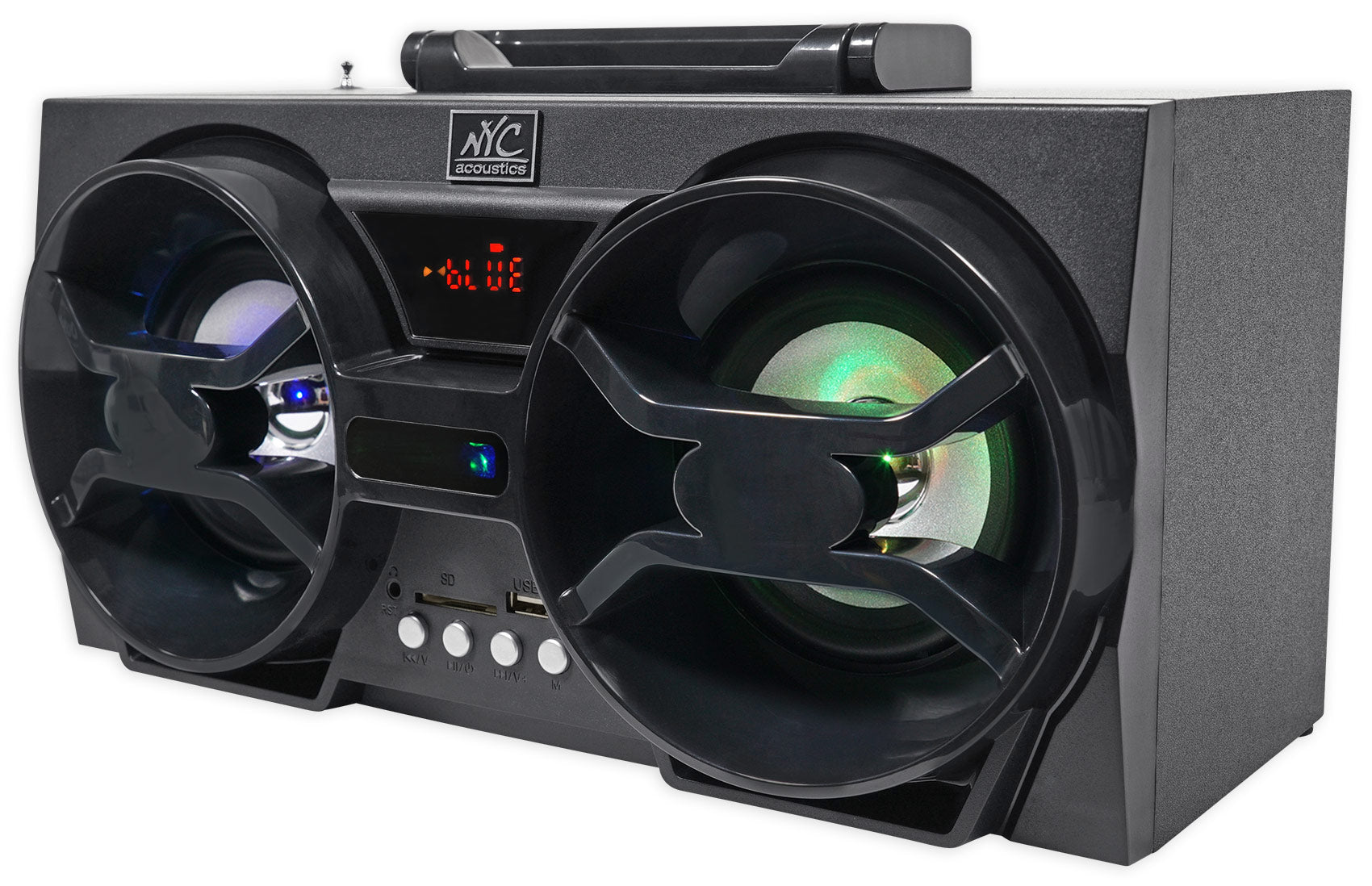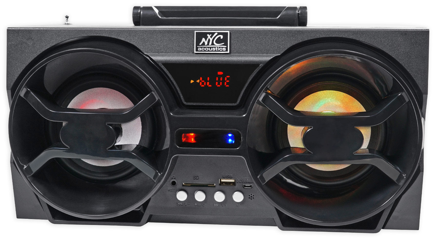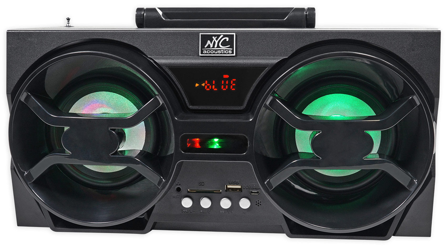 - NYC Acoustics Dual 4” 30 Watt Bluetooth Boombox Speaker w/LED Lights, USB, SD
