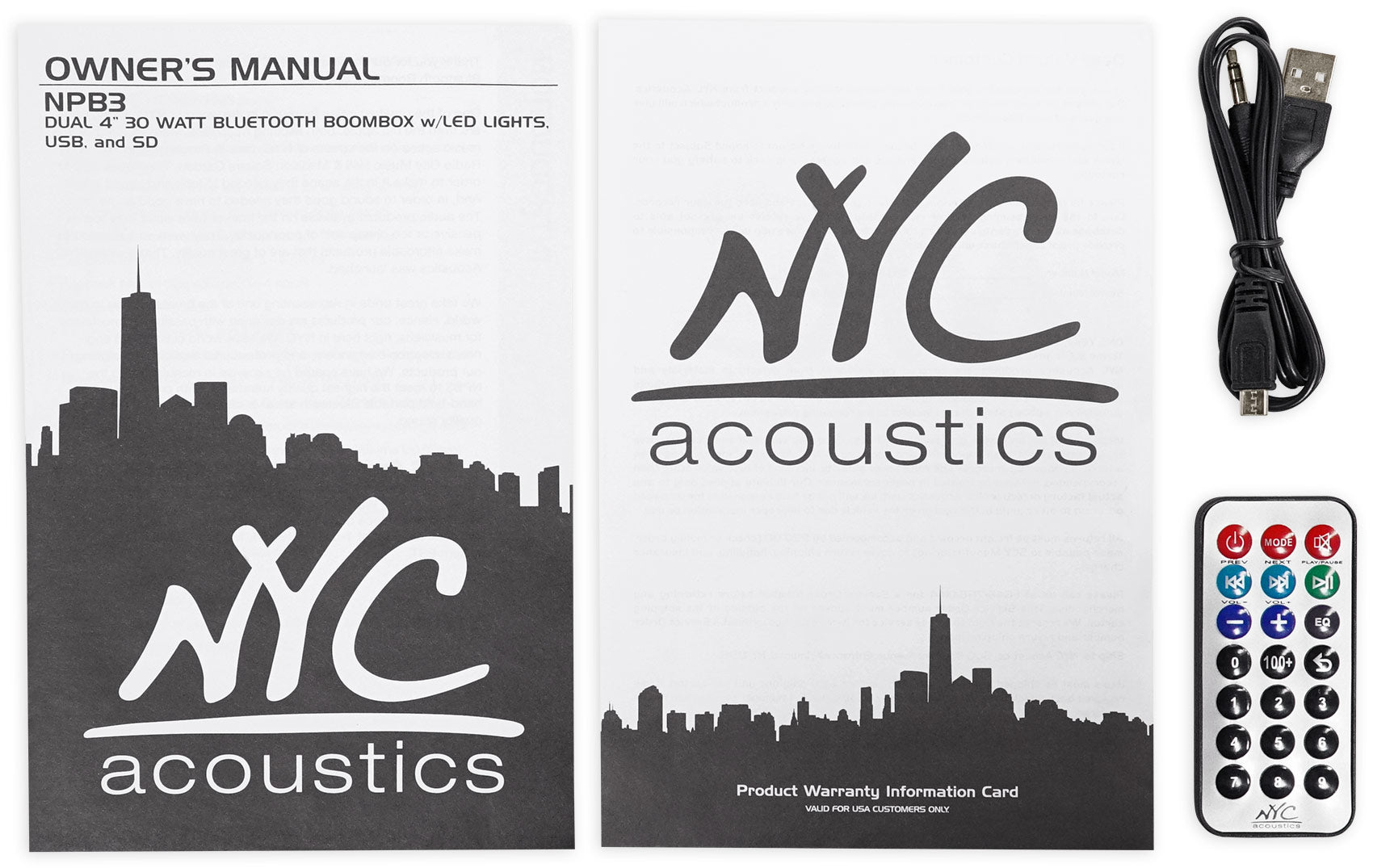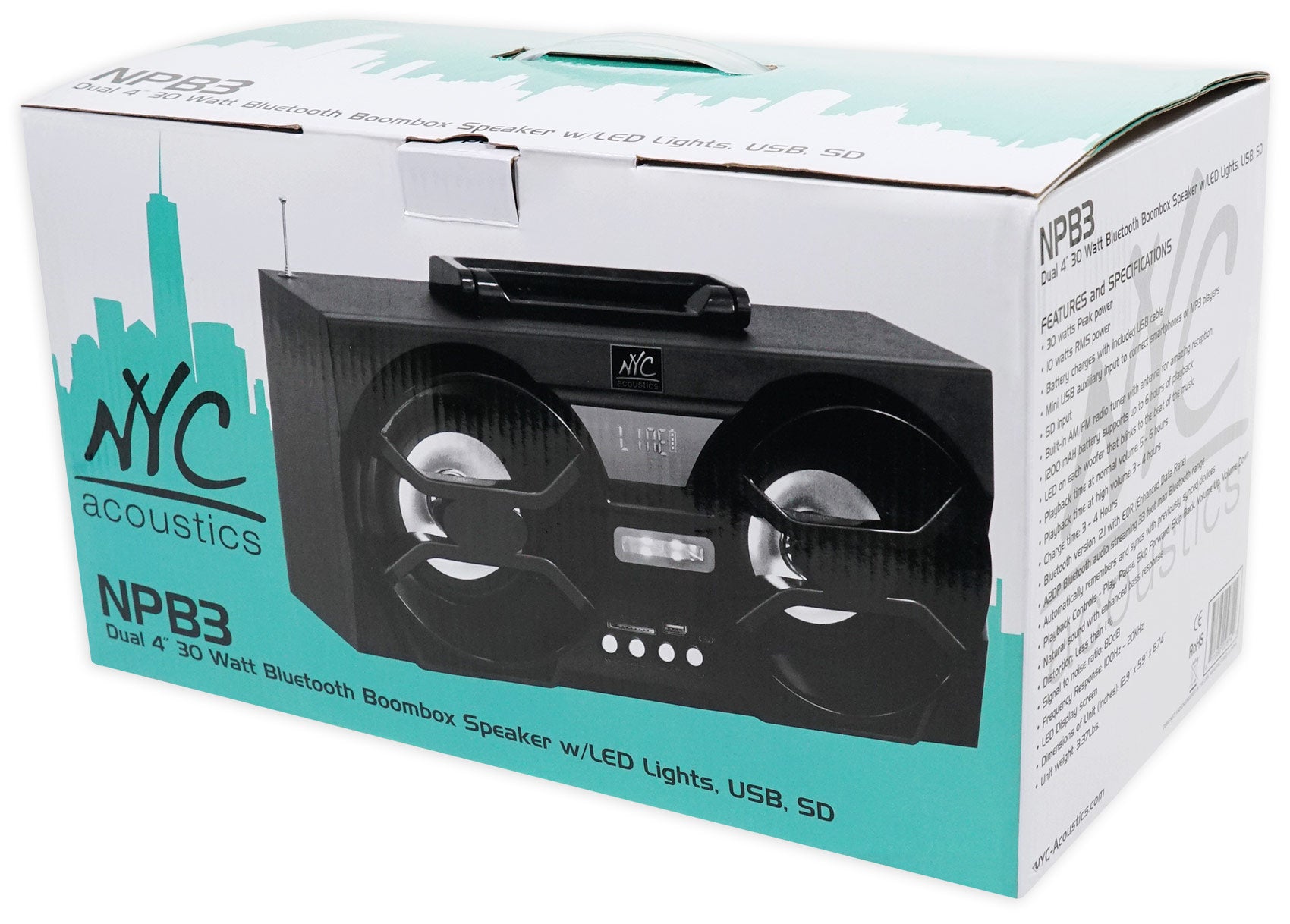 NYC Acoustics NPB3 Dual 4" 30w Bluetooth Boombox Speaker w/USB, SD, LED+Remote