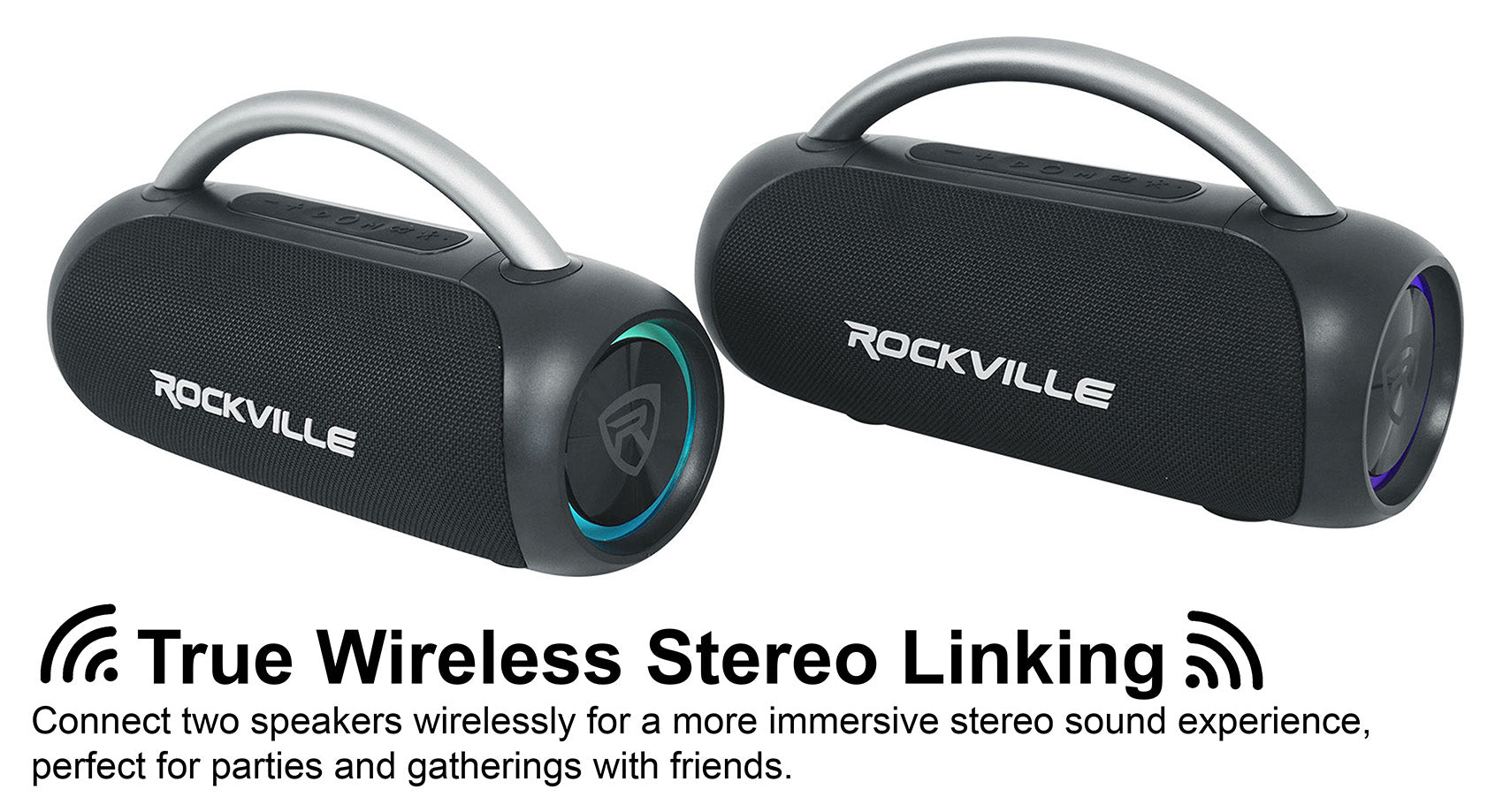 The Rockville RPB-D3 is a large, powerful and portable Bluetooth speaker that delivers balanced sound with impressive bass and clear highs. Designed for both indoor and outdoor use, this speaker is IPX5 waterproof, making it perfect for parties, days at the beach, and more. With True Wireless Stereo (TWS) technology, you can link two RPB-D3 speakers together for an enhanced stereo experience. Complete with vivid LED lighting and long-lasting battery life, this speaker offers excellent sound quality and great portability for all your audio needs.