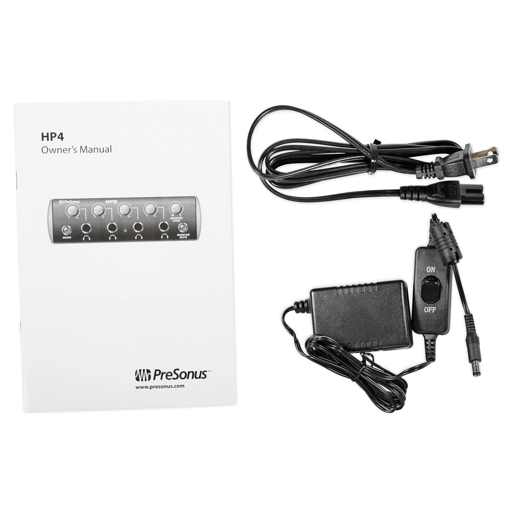 Includes four PreSonus HD9 closed-back professional studio headphones and a PreSonus HP4 four-channel headphone amplifier.