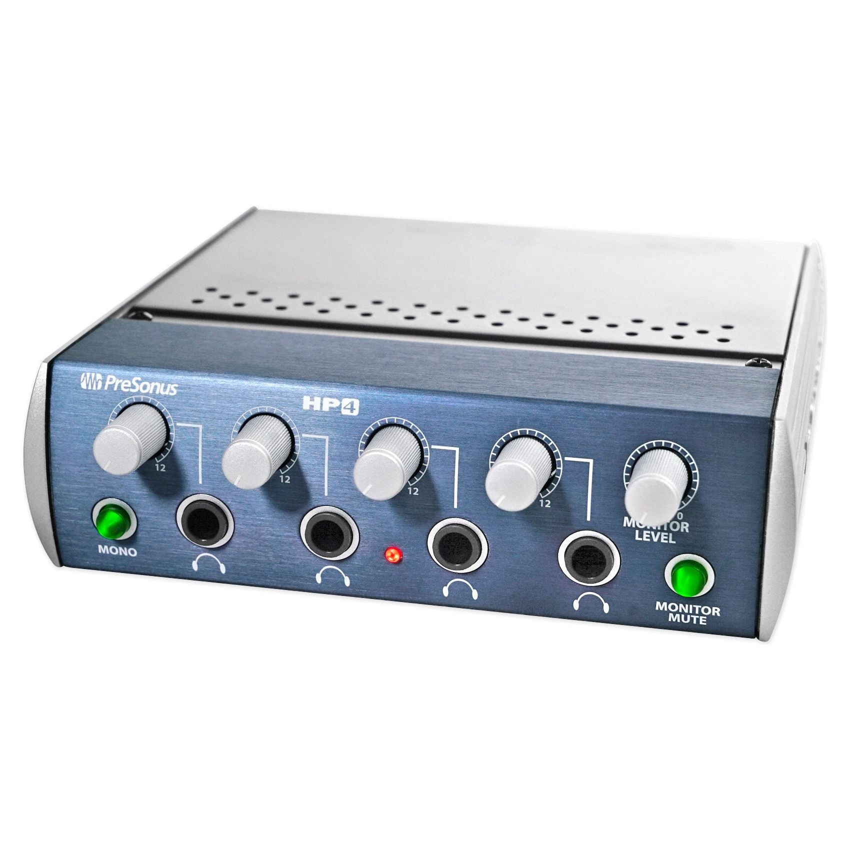 HP4: Four screaming-loud (150 mW per channel) stereo headphone outputs; 2 balanced ¼-inch, line-level monitor outputs that can be used to daisy-chain additional headphone amps; 2 balanced ¼-inch, line-level inputs; headphone level control and Mono summing switch for each channel.