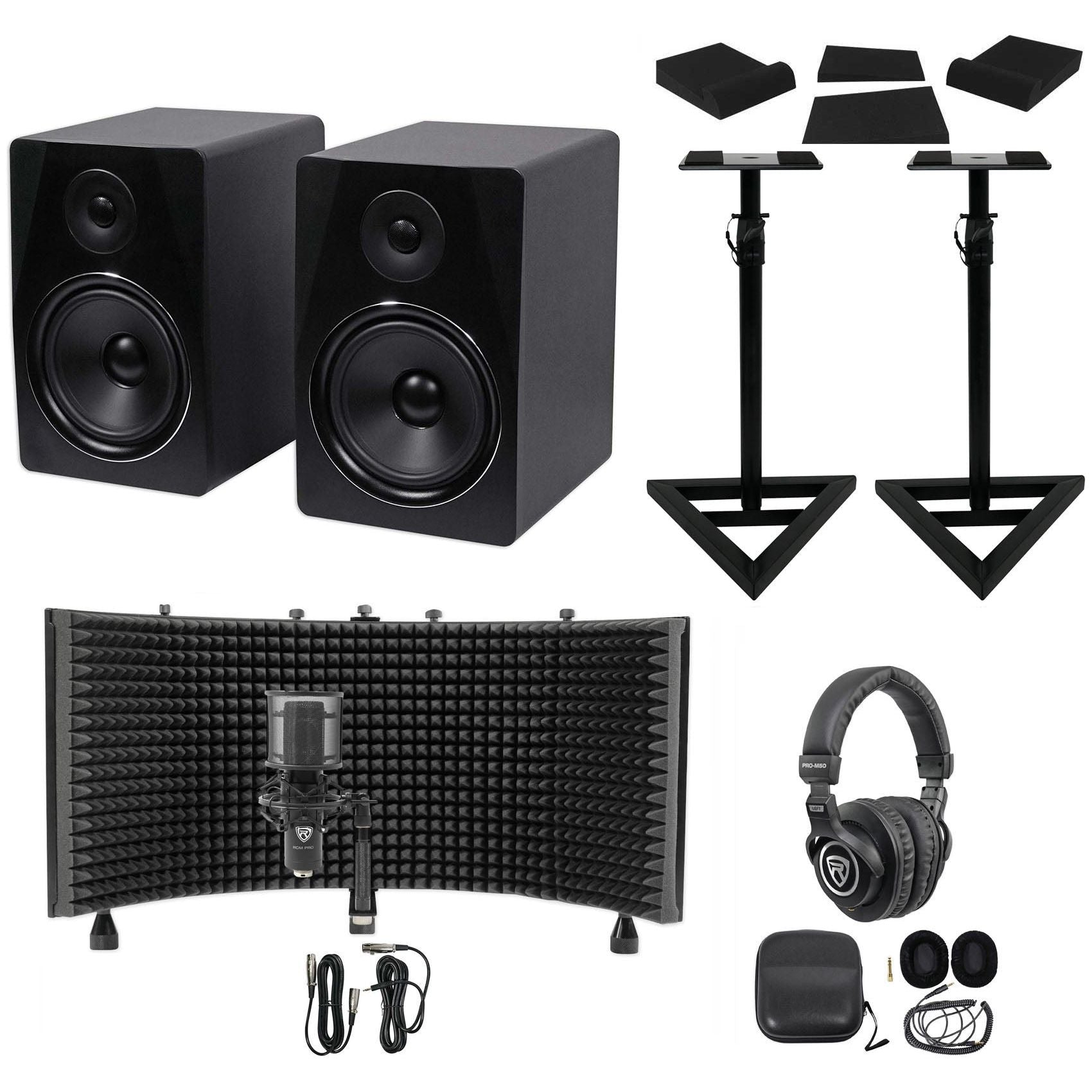 2) Rockville APM8B 8" Active Studio Monitors+Stands+Mic+Headphones+Iso Shield