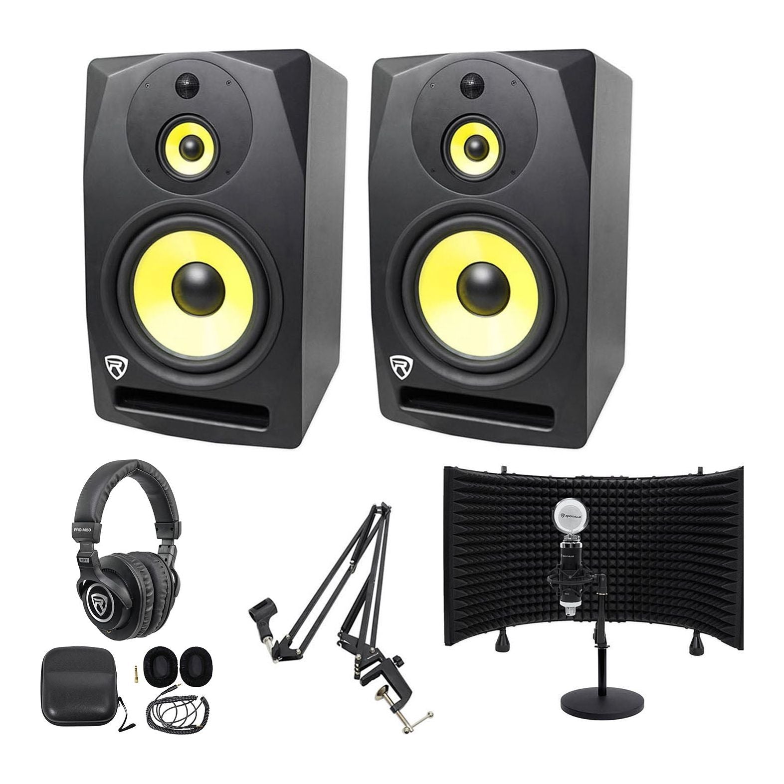 (2) Rockville DPM10B 10" 800w Active Studio Monitors+Headphones+Mic+Shield & Stand