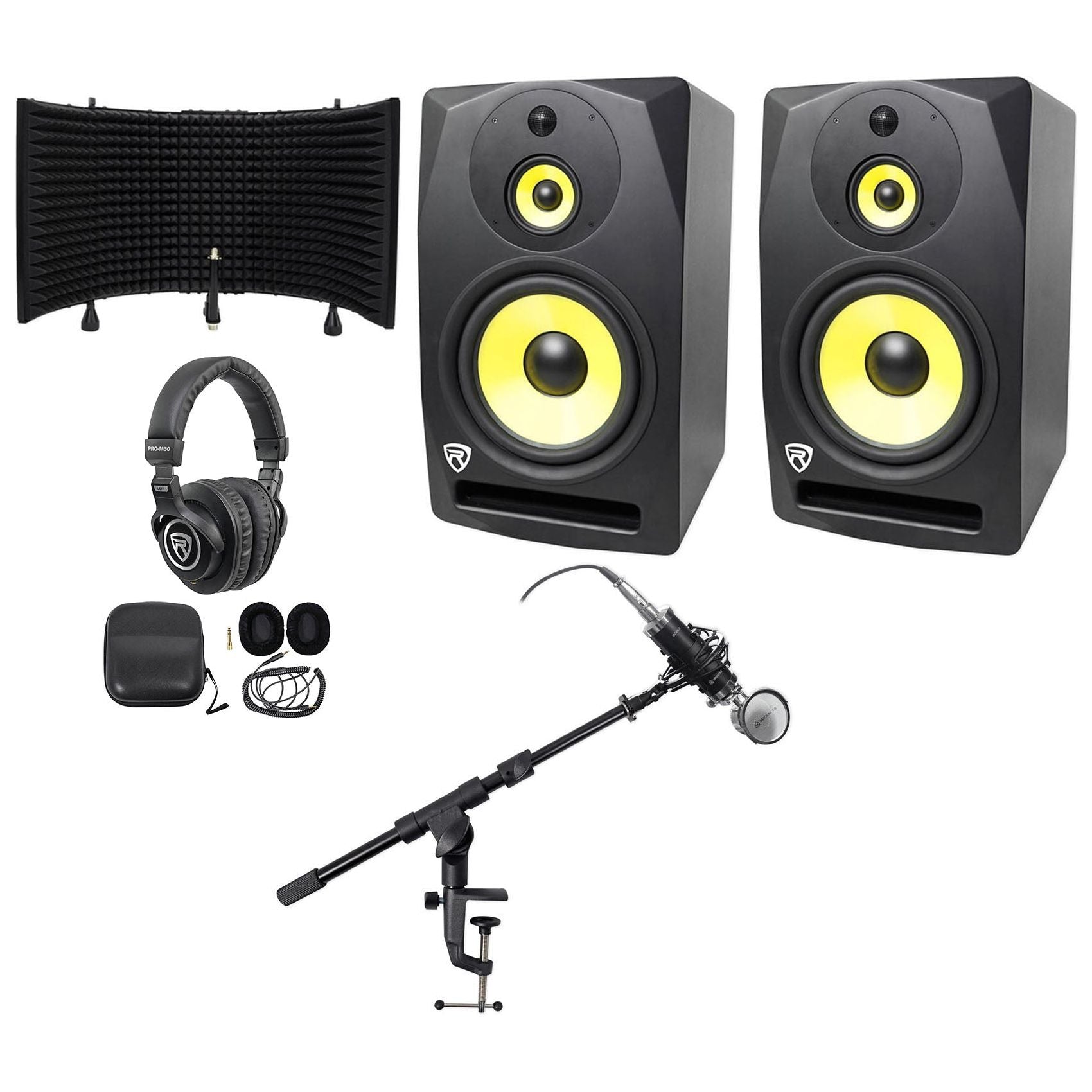 2) Rockville DPM10B 10" 800w Active Studio Monitors+Headphones+Mic+Shield w/ Stand