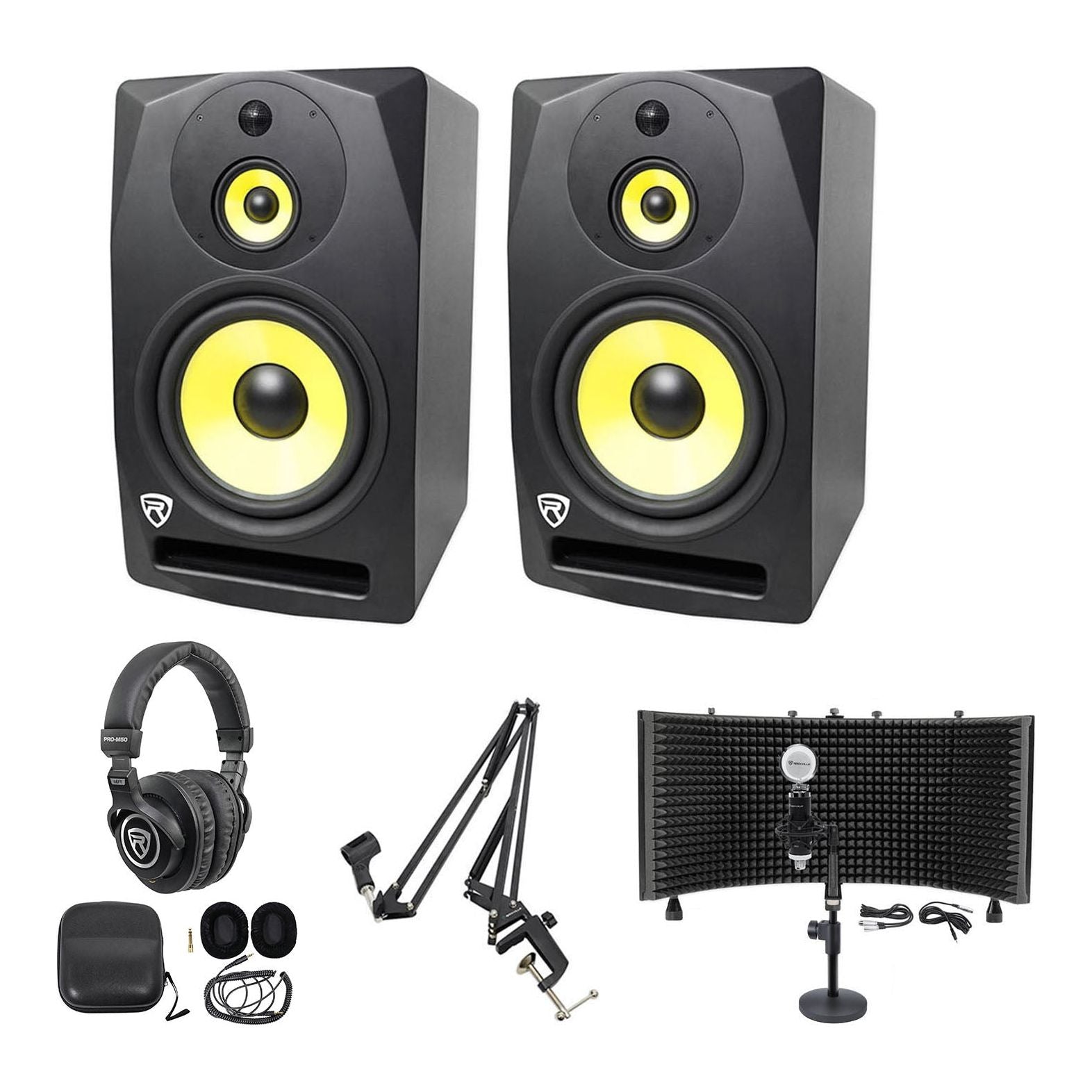 (2) Rockville DPM10B 10 inches 800w Active Studio Monitors+Headphones+Mic+Shield+Stand