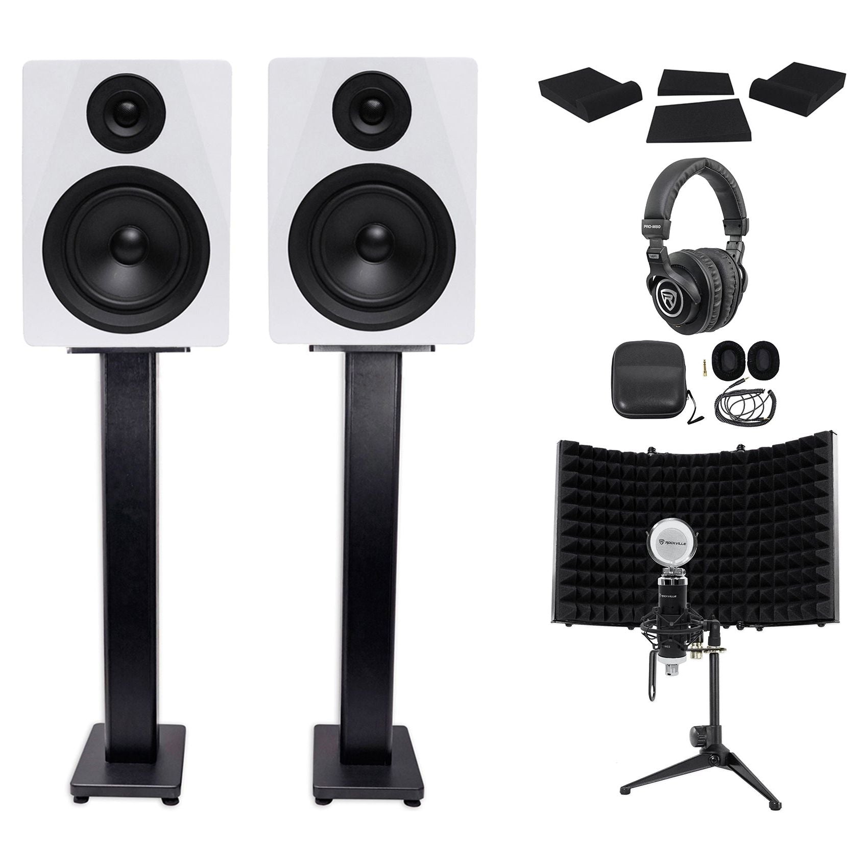 2 Rockville DPM5W 5.25" 300 Active Studio Monitors+Stands+Headphones+Mic+Shield