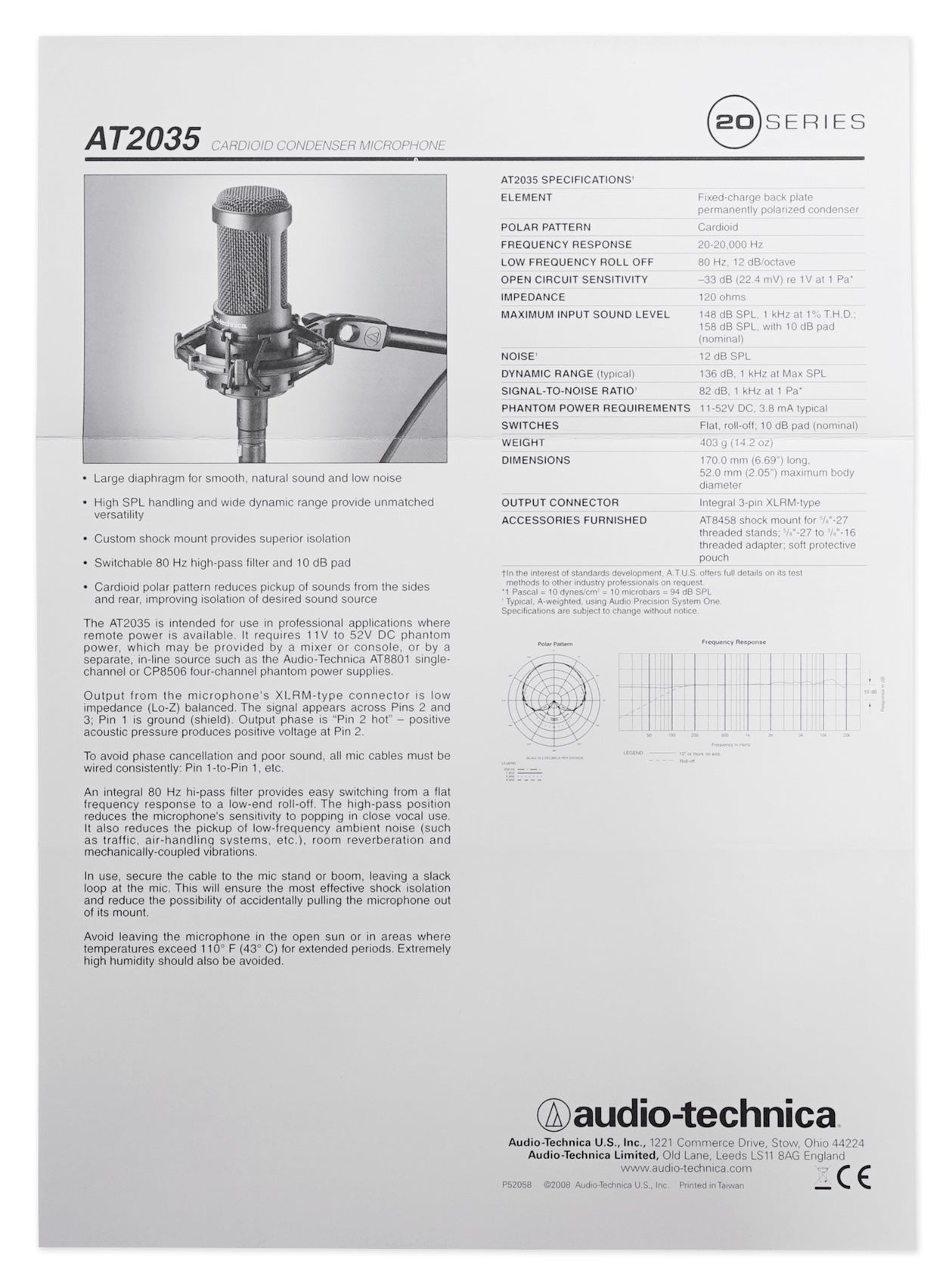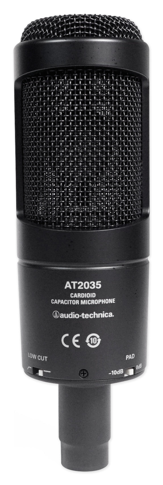 The rugged AT2035 side-address studio condenser microphone delivers exceptional detail and low noise. Equipped with a switchable 80 Hz high-pass filter and 10 dB pad, the AT2035 handles high sound pressure levels with ease. The mic comes with an AT8458 shock mount to attenuate any noise, shock or vibration that’s transmitted through boom. Its analog XLR output connects easily to a digital converter or mixer.