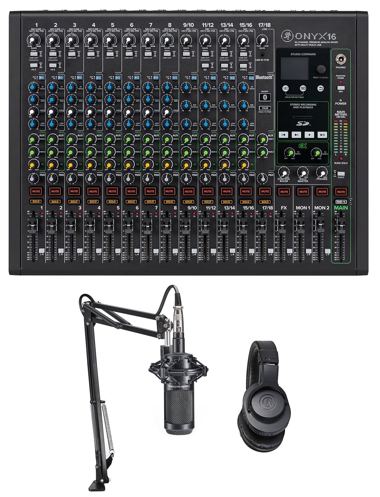 Mackie ONYX16 16-Channel Analog Mixer w/Bluetooth+Audio Technica Mic+Headphones