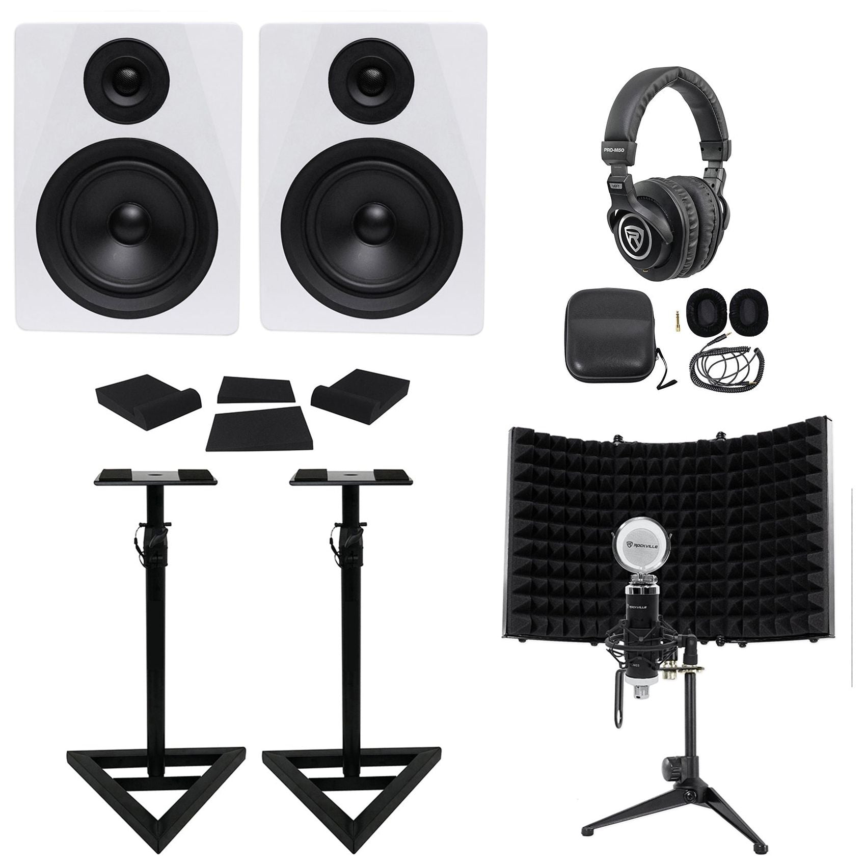 Pair Rockville DPM5W 5.25" 300 Watt Studio Monitors+Stands+Headphones+Mic+Shield