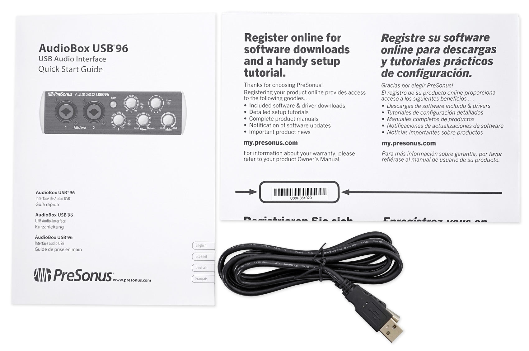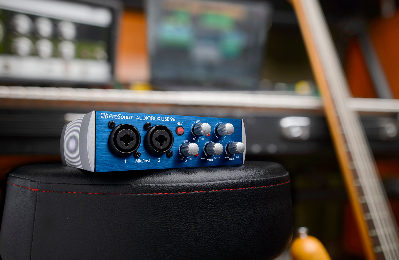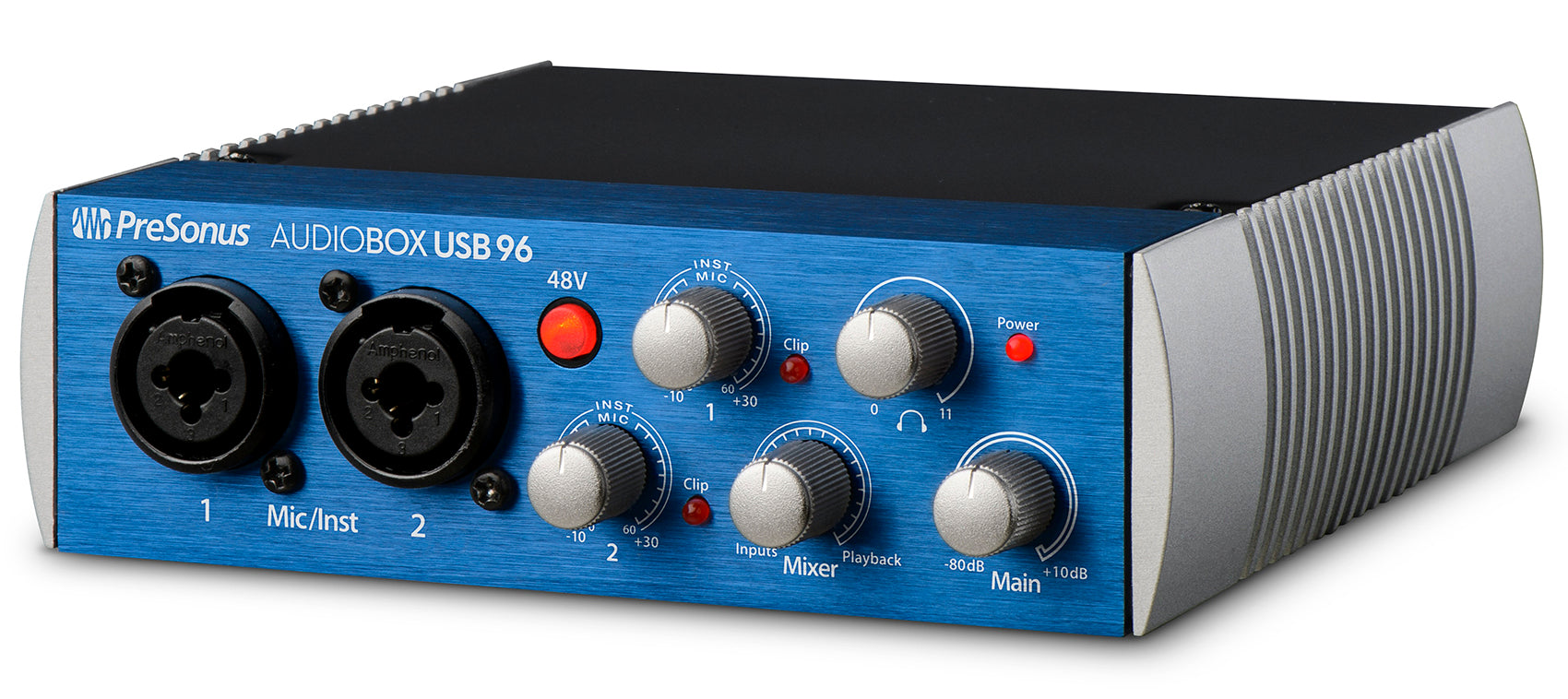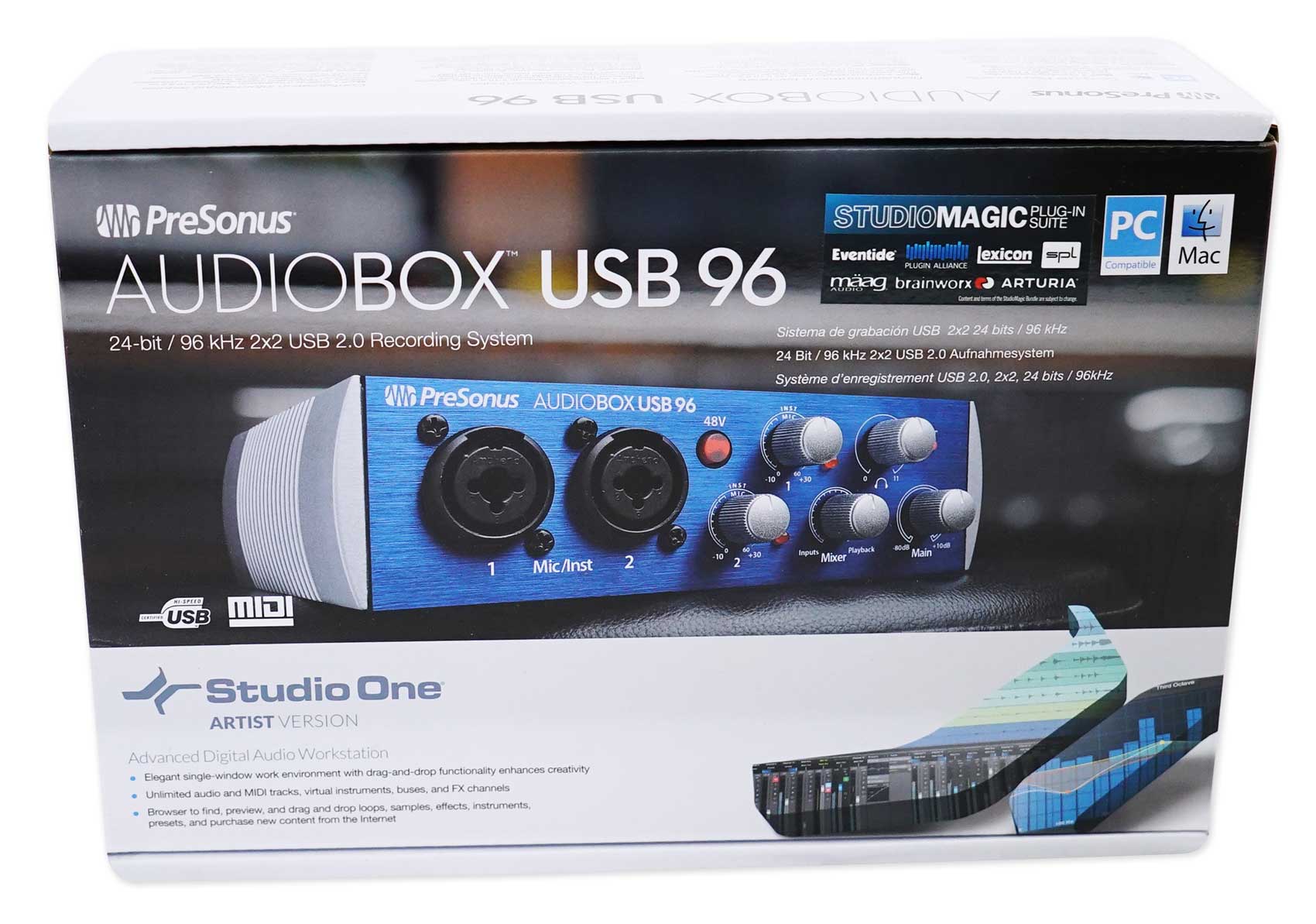 This convenient, portable USB 2.0 audio and MIDI interface lets you record anywhere at up to 96 kHz. A great choice for mobile musicians and podcasters, the 2-channel AudioBox USB® 96 is bus-powered, compact, ruggedly built, and works with virtually any PC or Mac recording software. It boasts high-performance Class A mic preamplifiers and professional-quality, 24-bit, 96 kHz converters. And it comes with PreSonus’ amazing Studio One® 3 Artist DAW software for Mac® and Windows®.