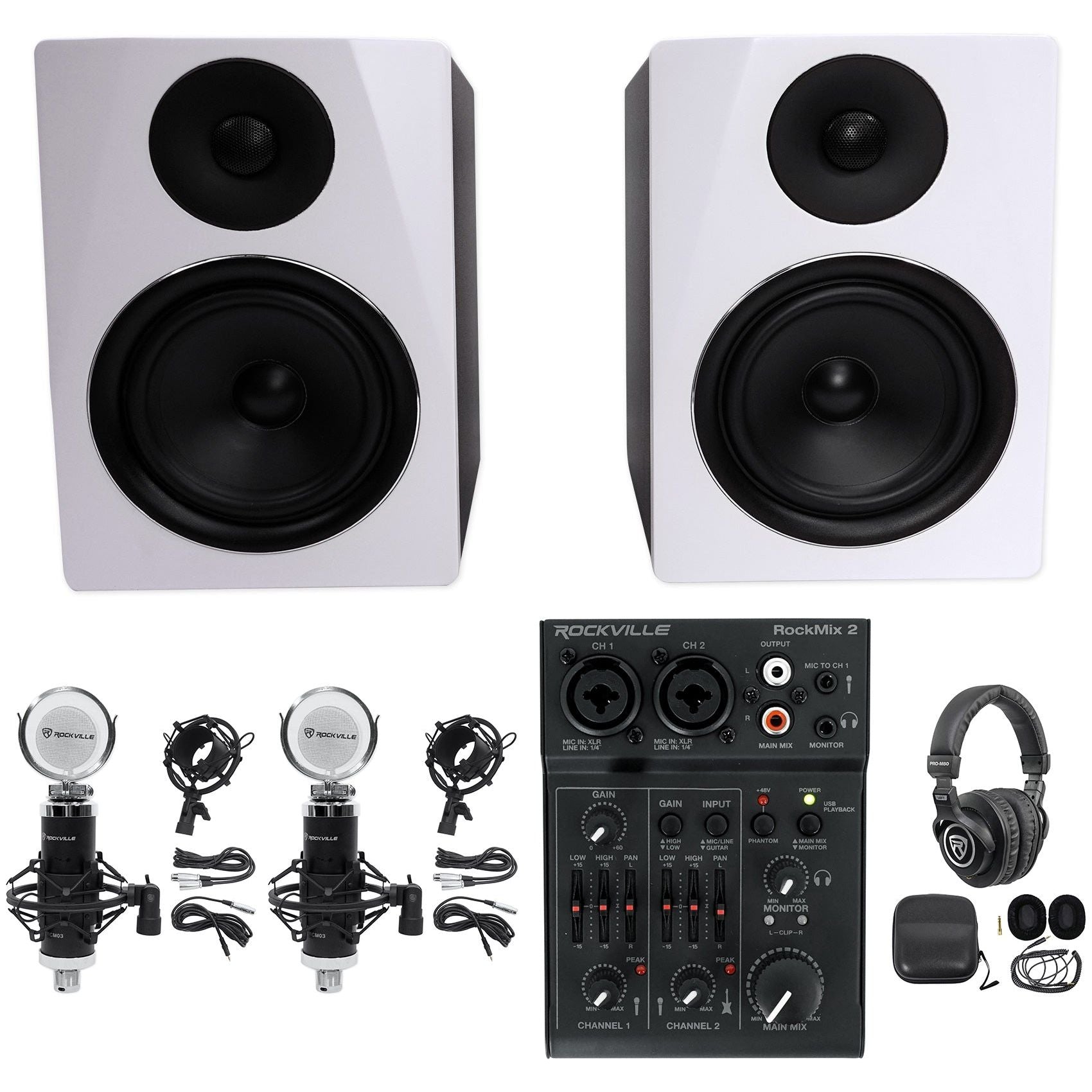 Rockville Recording Kit: 2) 6.5" White Studio Monitors+USB Mixer+Mics+Headphones