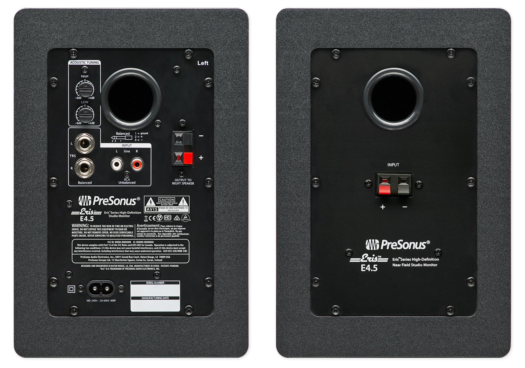 PreSonus® Eris-series studio monitors are used worldwide by studio engineers who need to hear every detail of their recordings. Ideal for gaming and home video production, the Eris E4.5 delivers studio-quality sound yet is compact enough to fit almost anywhere. You get the flexibility of rear-panel, ¼-inch TRS and RCA inputs; front-panel 1/8” stereo, unbalanced line inputs for use with mobile audio devices; a convenient front-panel volume control; and an integrated headphone amplifier. Fine-adjust the speaker’s response with low- and high-frequency tuning controls. It may be small but the E4.5 is loud, as well as clear, thanks to a 25W/side Class AB power amp.