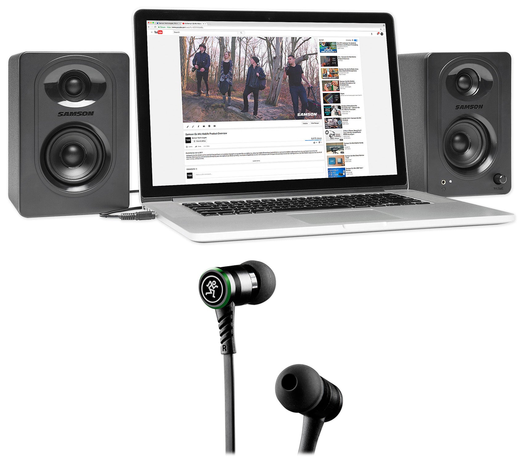 (2) SAMSON M30 Powered 20w Studio/Computer/Podcast Monitors+Mackie Earbuds