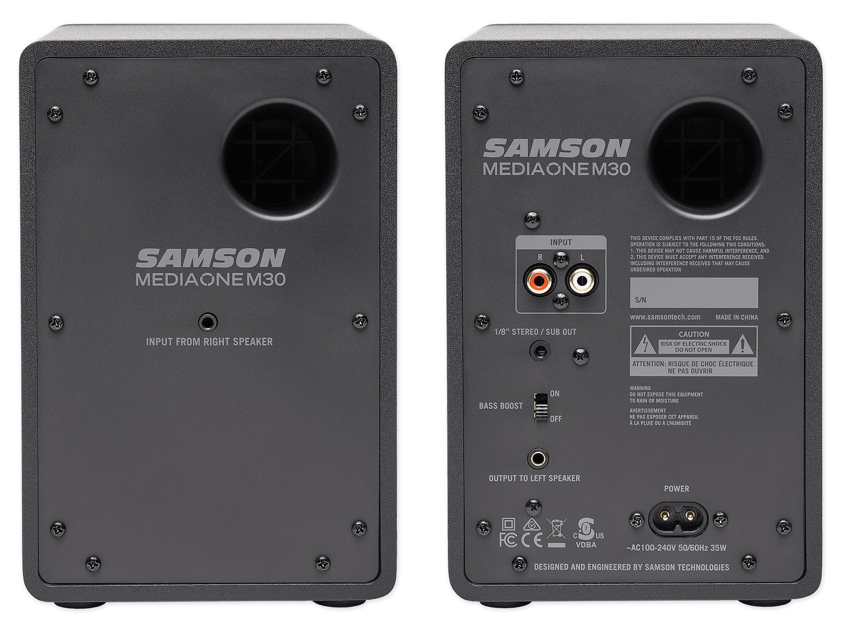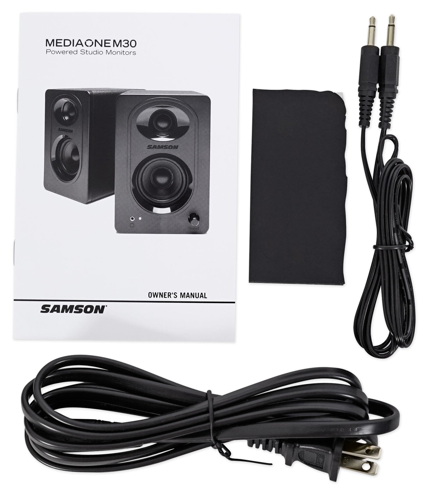 Samson’s MediaOne M30 Powered Studio Monitors are a compact, full-range speaker solution for all your desktop and multimedia applications. Whether you're listening to music, producing tracks, watching videos or gaming, this stereo monitor pair features an internal amplifier, solid wood construction and high-quality components that produce big sound, while occupying minimal desktop space..