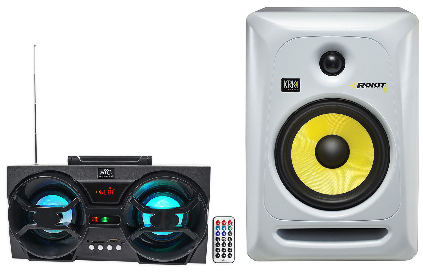 - (1) NYC Acoustics NPB3 Dual 4" 30w Bluetooth Boombox Speaker w/USB, SD, LED+Remote