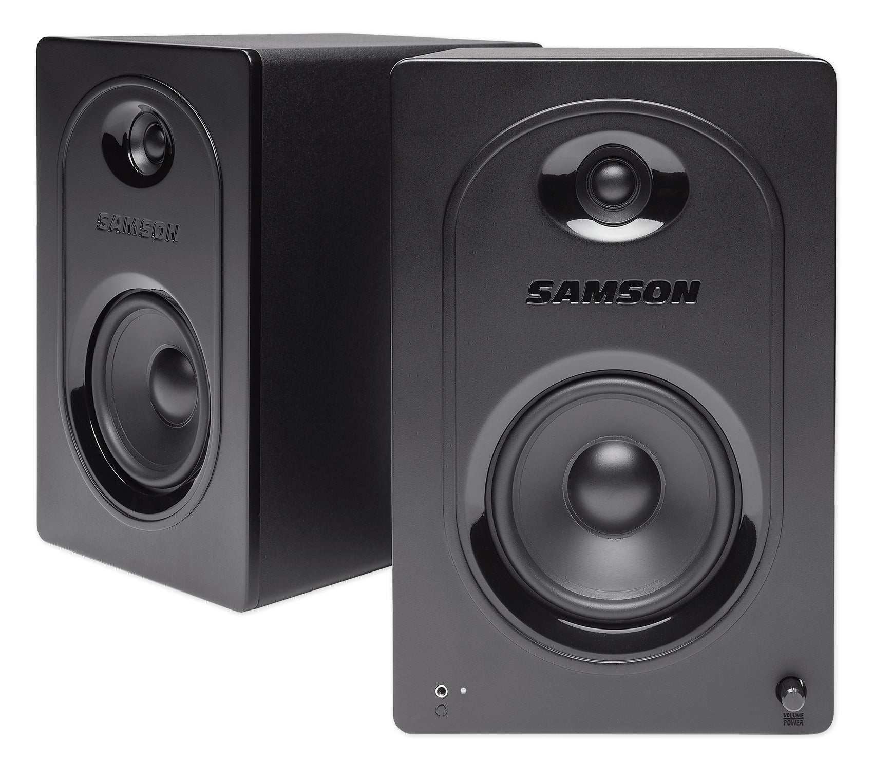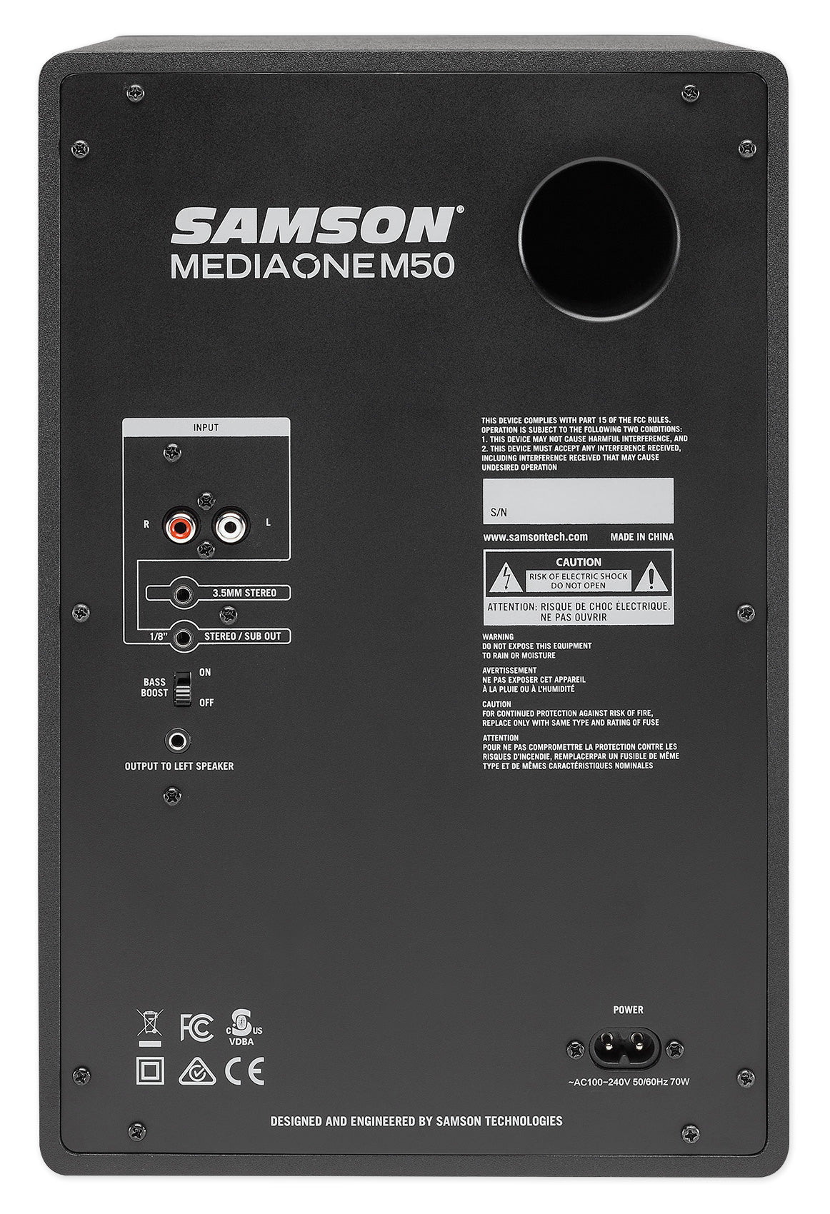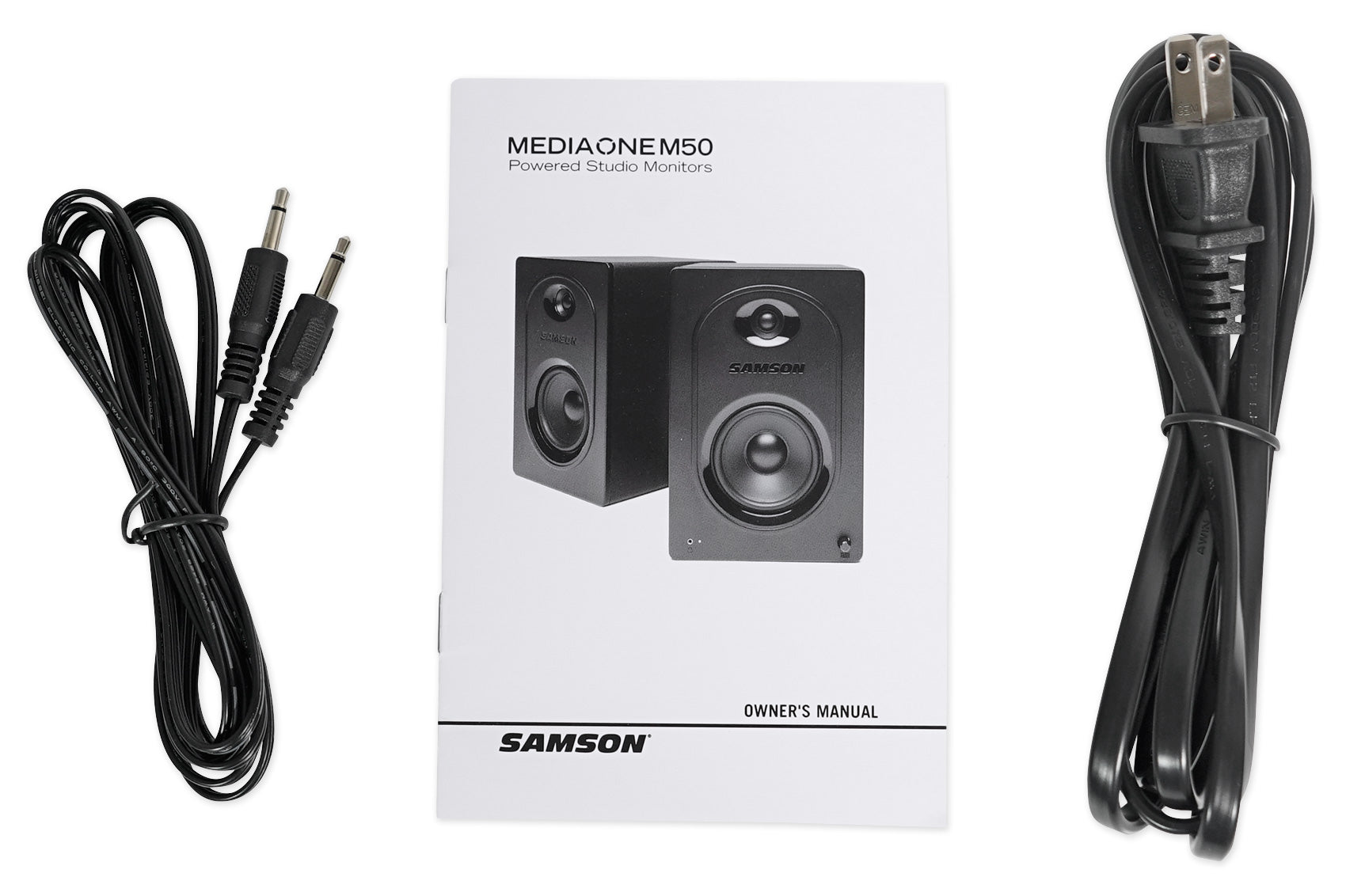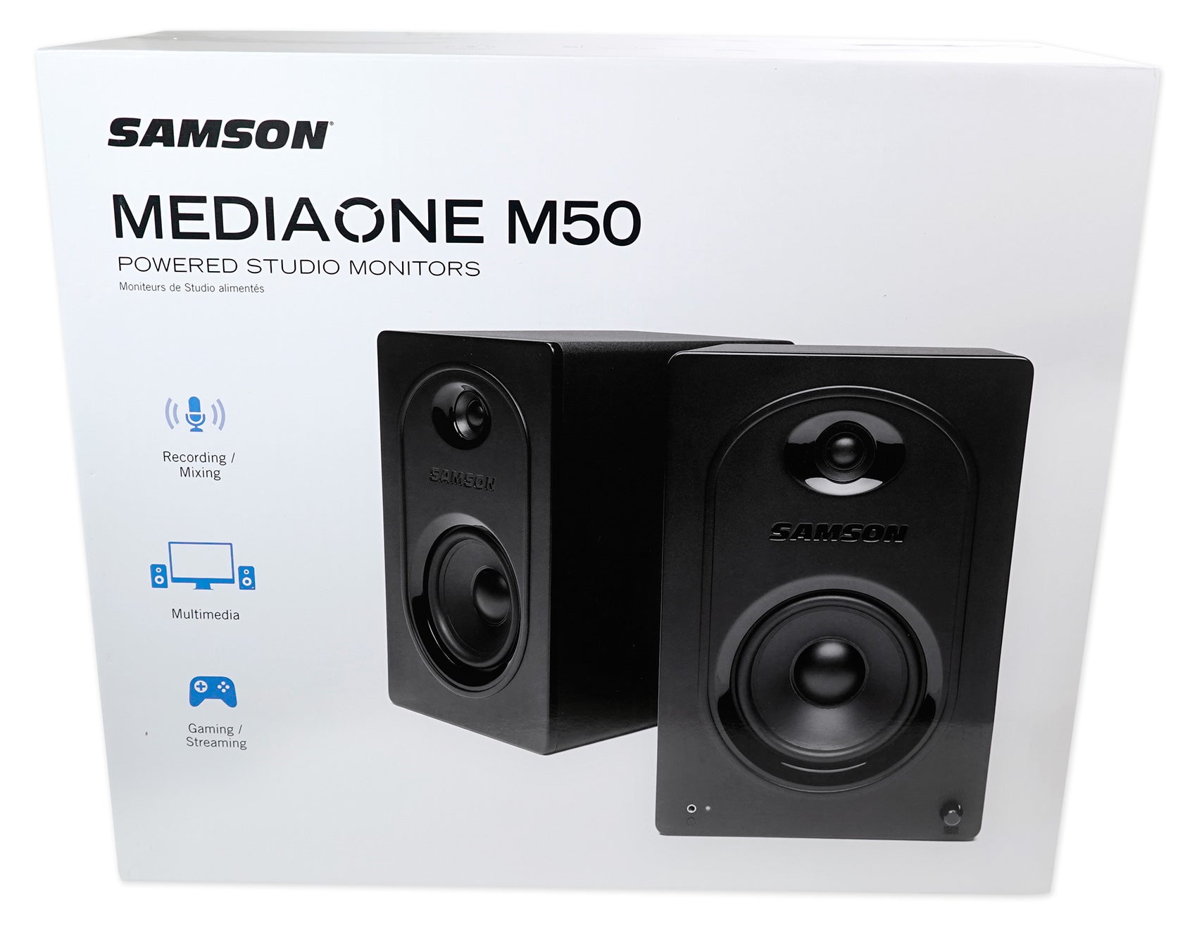 The Samson MediaOne M50 Powered Studio Monitors are a full-range speaker solution for all your desktop and multimedia applications. Whether you're listening to music, producing tracks, watching videos or gaming, this stereo monitor pair features an internal amplifier, solid wood construction and high-quality components that bring big, balanced sound to your desktop space.