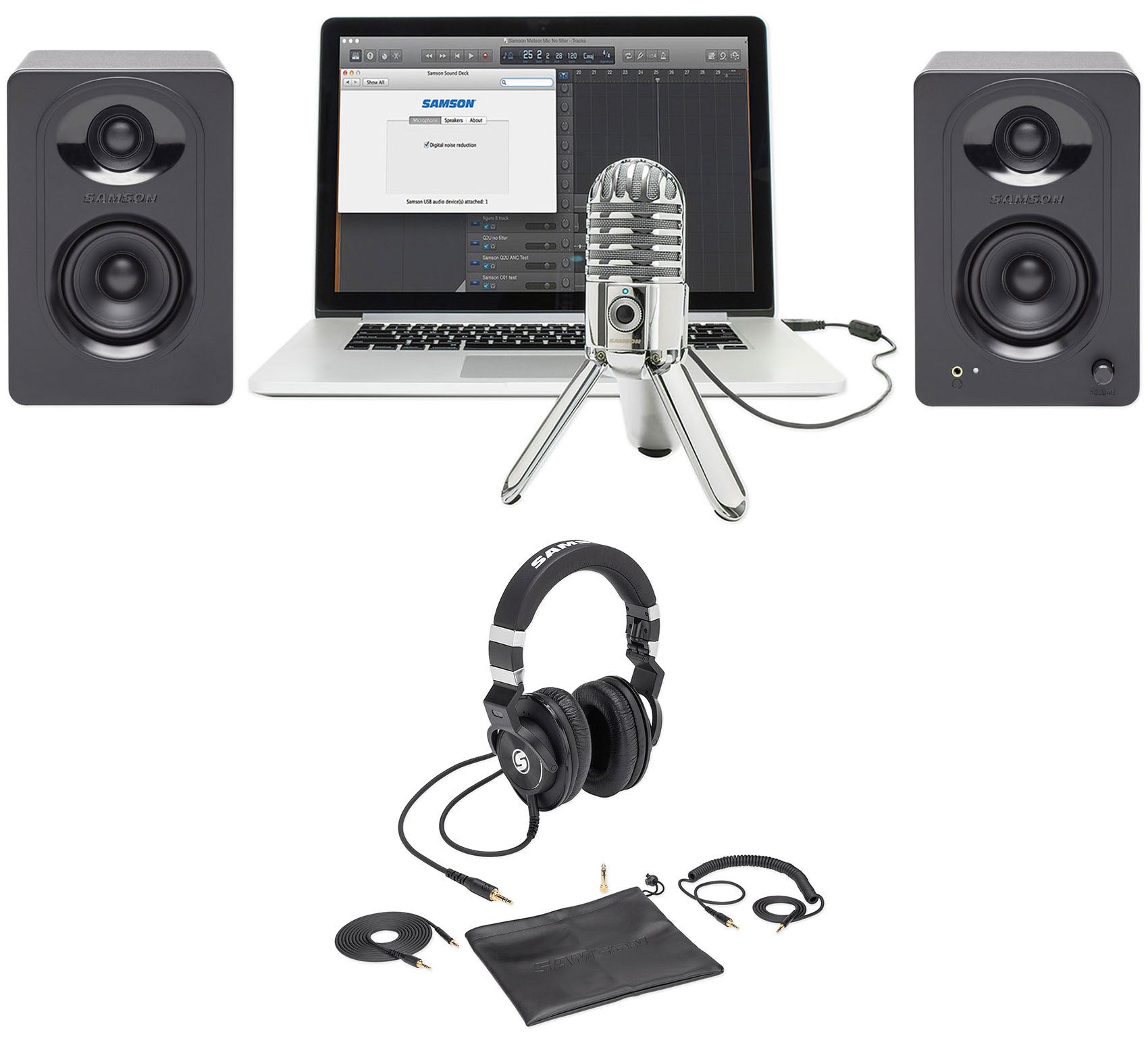 Samson Podcast Podcasting Microphone+Z45 Headphones+Pair Monitor Speakers