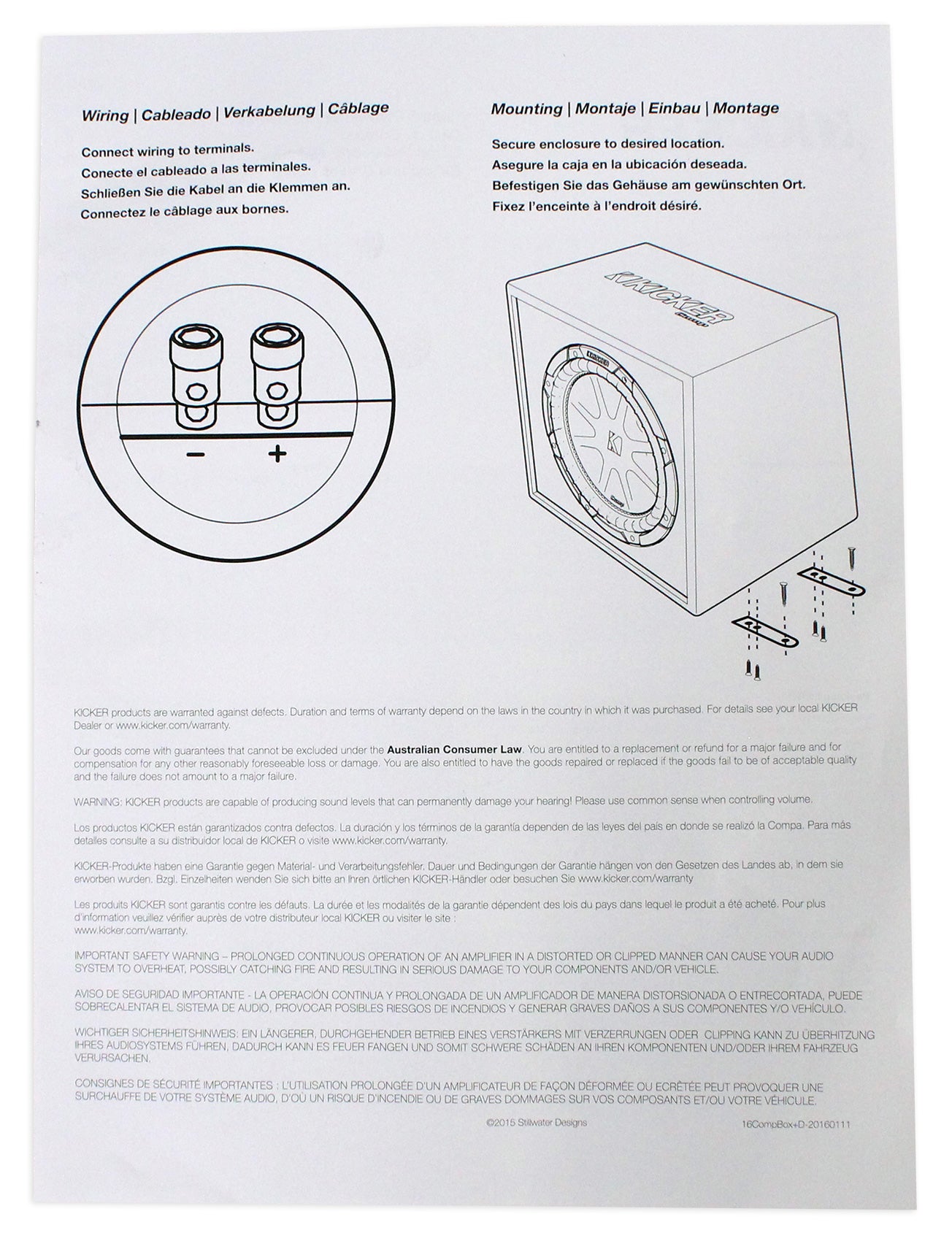 The 2016 Comp 10-Inch Subwoofer Enclosure comes loaded with a single 4-Ohm terminal. With a powerful KICKER Comp sub behind the truck bench, this thin Comp sub box delivers both convenience and raw power - all in the one package. KICKER® 2016 Comp Loaded Enclosures deliver a new look and flexible designs to work with any car or truck. The Comp 10-Inch Loaded Enclosure works best with 150 watts of recommended power.