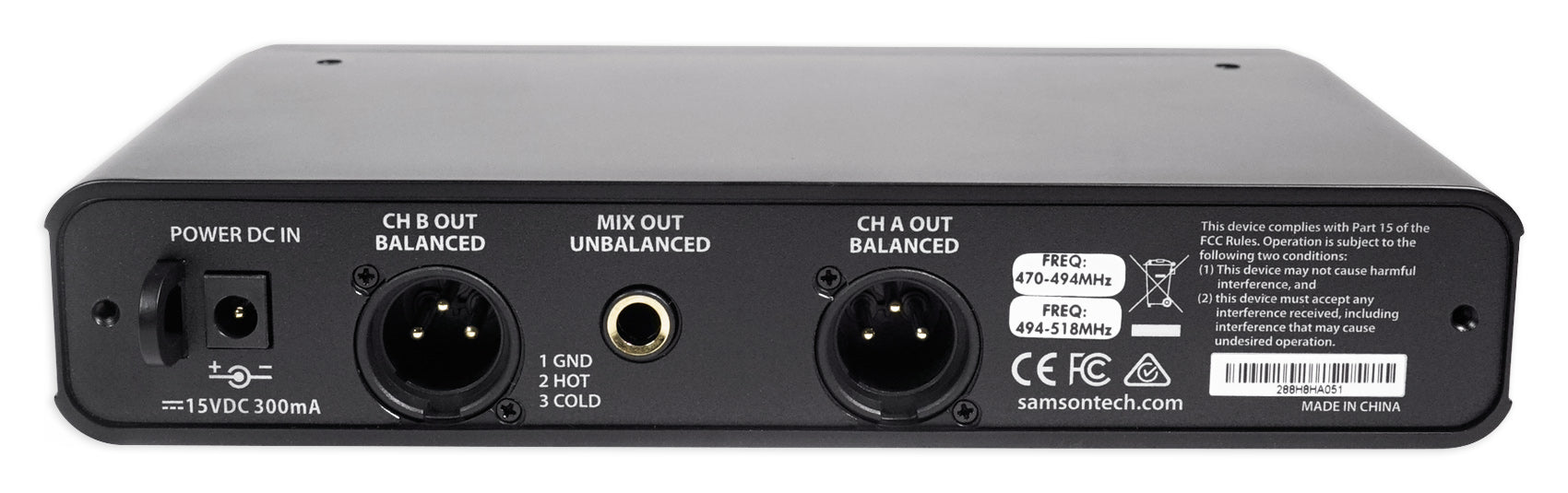 Featuring a user-friendly front panel, the CR288 Wireless Receiver provides the system with fast and easy setup. To find your optimal channel, the CR288 provides two Select buttons for auto syncing the receiver and transmitter channels via an infrared signal. The panel also contains a dual 7-segment LED for the operating channels, two Volume knobs, two tuned antennas, as well as Ready and Peak indicators for optimal functionality and monitoring. The back of the receiver features two separate balanced XLR outputs for routing signals to two separate mixer channels, as well as a 1/4" unbalanced mix output that condense both signals to a single channel for a direct connection into a PA speaker.