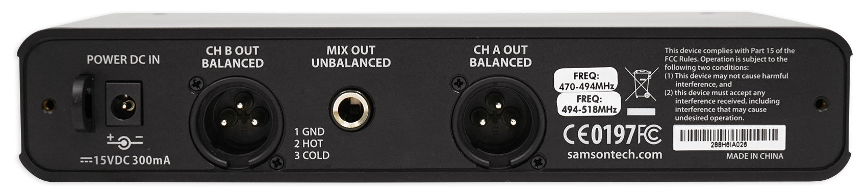 Featuring a user-friendly front panel, the CR288 Wireless Receiver provides the system with fast and easy setup. To find your optimal channel, the CR288 provides two Select buttons for auto syncing the receiver and transmitter channels via an infrared signal. The panel also contains a dual 7-segment LED for the operating channels, two Volume knobs, two tuned antennas, as well as Ready and Peak indicators for optimal functionality and monitoring. The back of the receiver features two separate balanced XLR outputs for routing signals to two separate mixer channels, as well as a 1/4" unbalanced mix output that condense both signals to a single channel for a direct connection into a PA speaker.