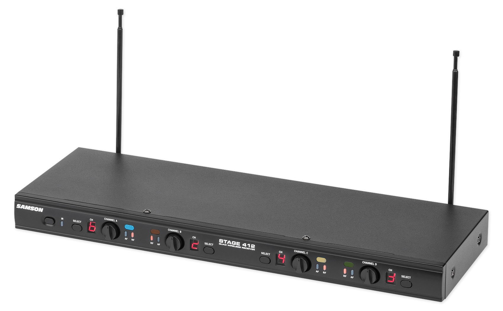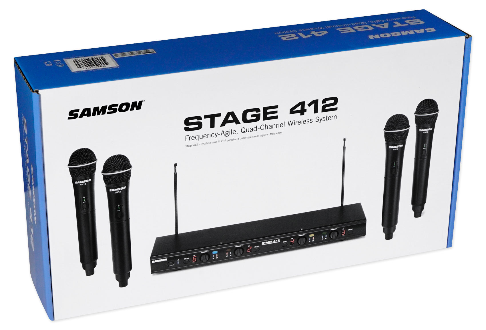 The Samson Stage 412 is a frequency-agile, quad-channel wireless microphone system with four handheld dynamic microphones that transmit to a single rugged metal receiver. Each handheld features Samson’s Q6 dynamic mic element, providing crisp, clear sound and reliable VHF wireless performance for presentation, education, house of worship, karaoke and other applications with up to four
