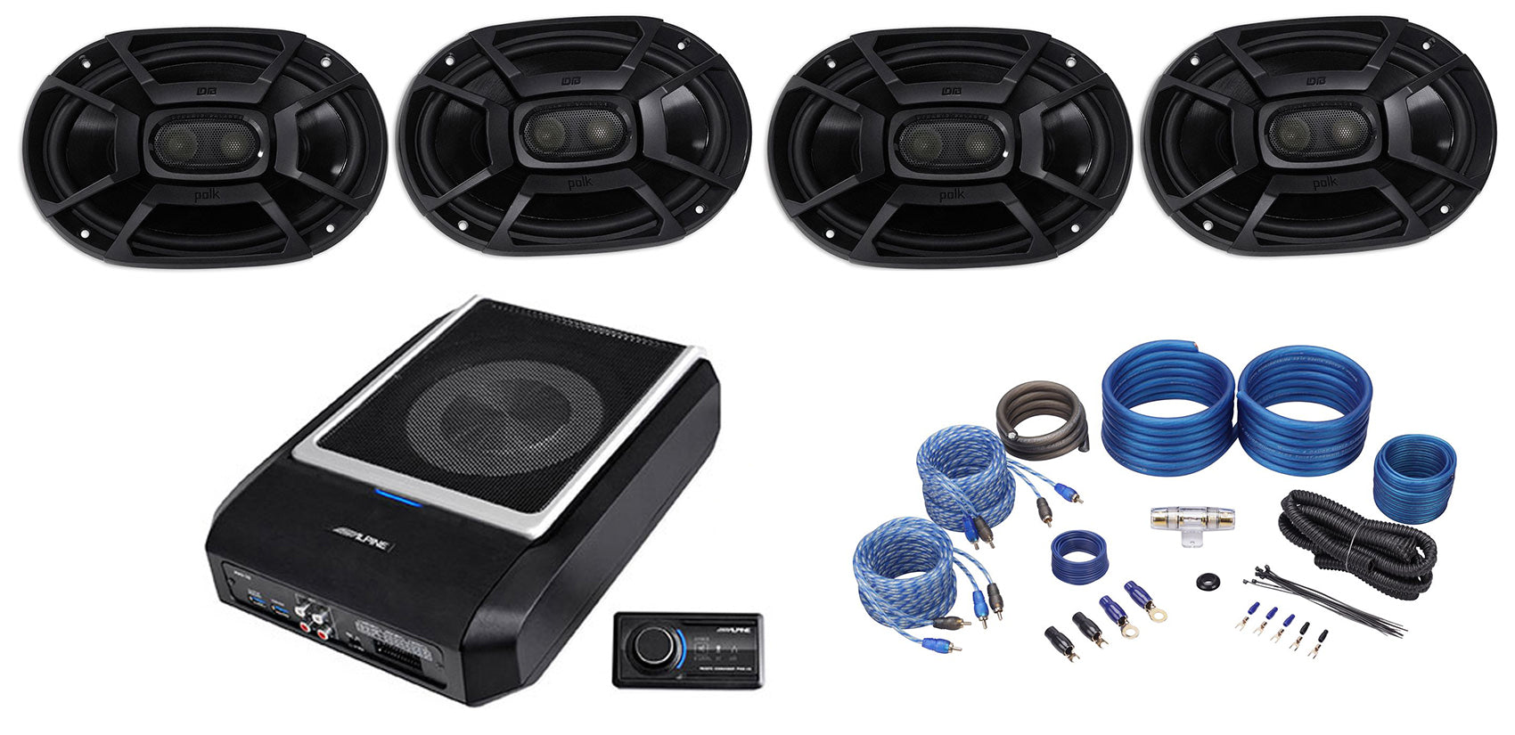 ALPINE PWD-X5 Slim Under-Seat Powered Subwoofer+Wire Kit+(4) Polk 6x9" Speakers