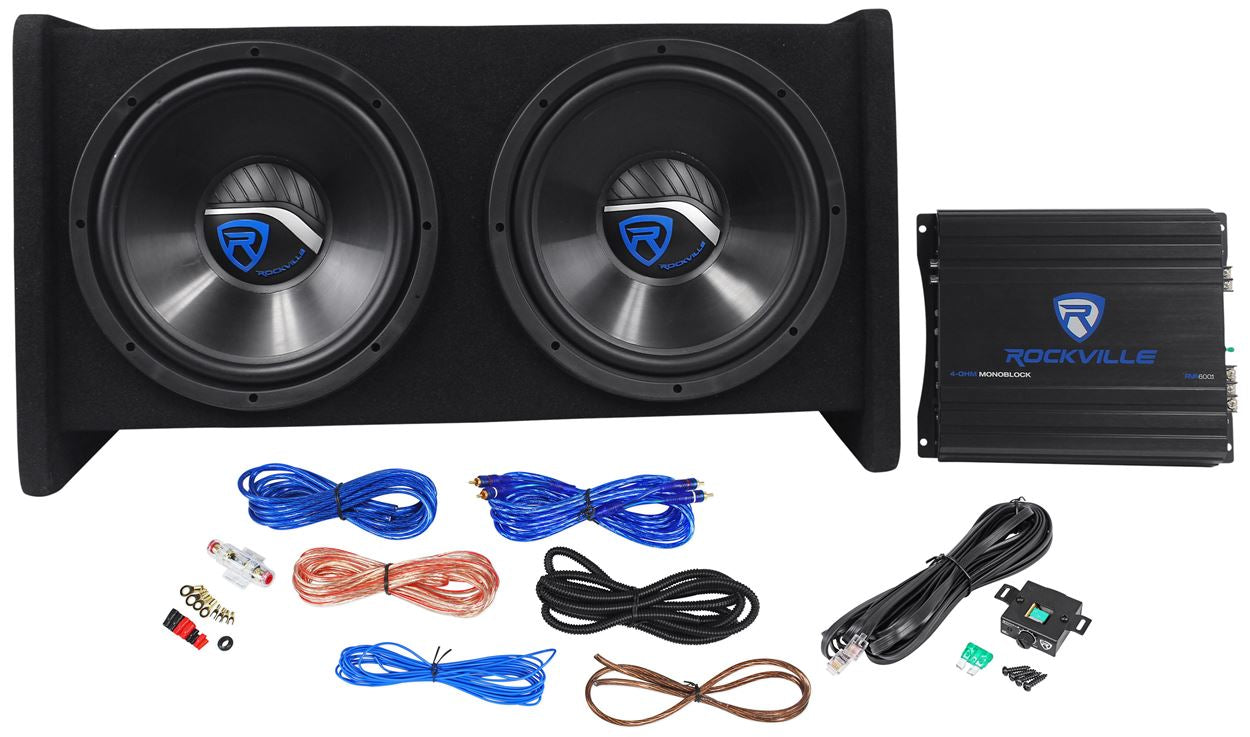 Rockville RV12.2A 1200w Dual 12" Car Subwoofer Enclosure+Mono Amplifier+Amp Kit