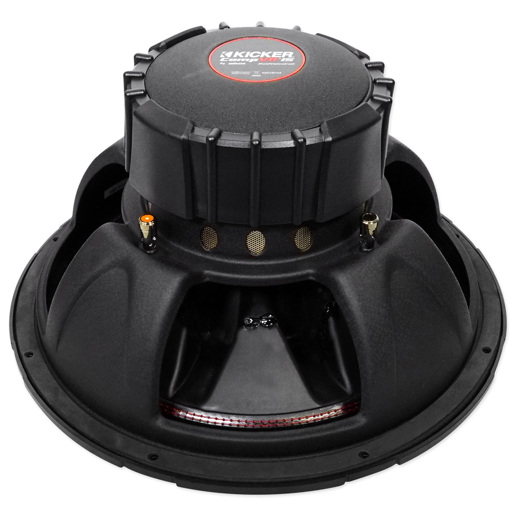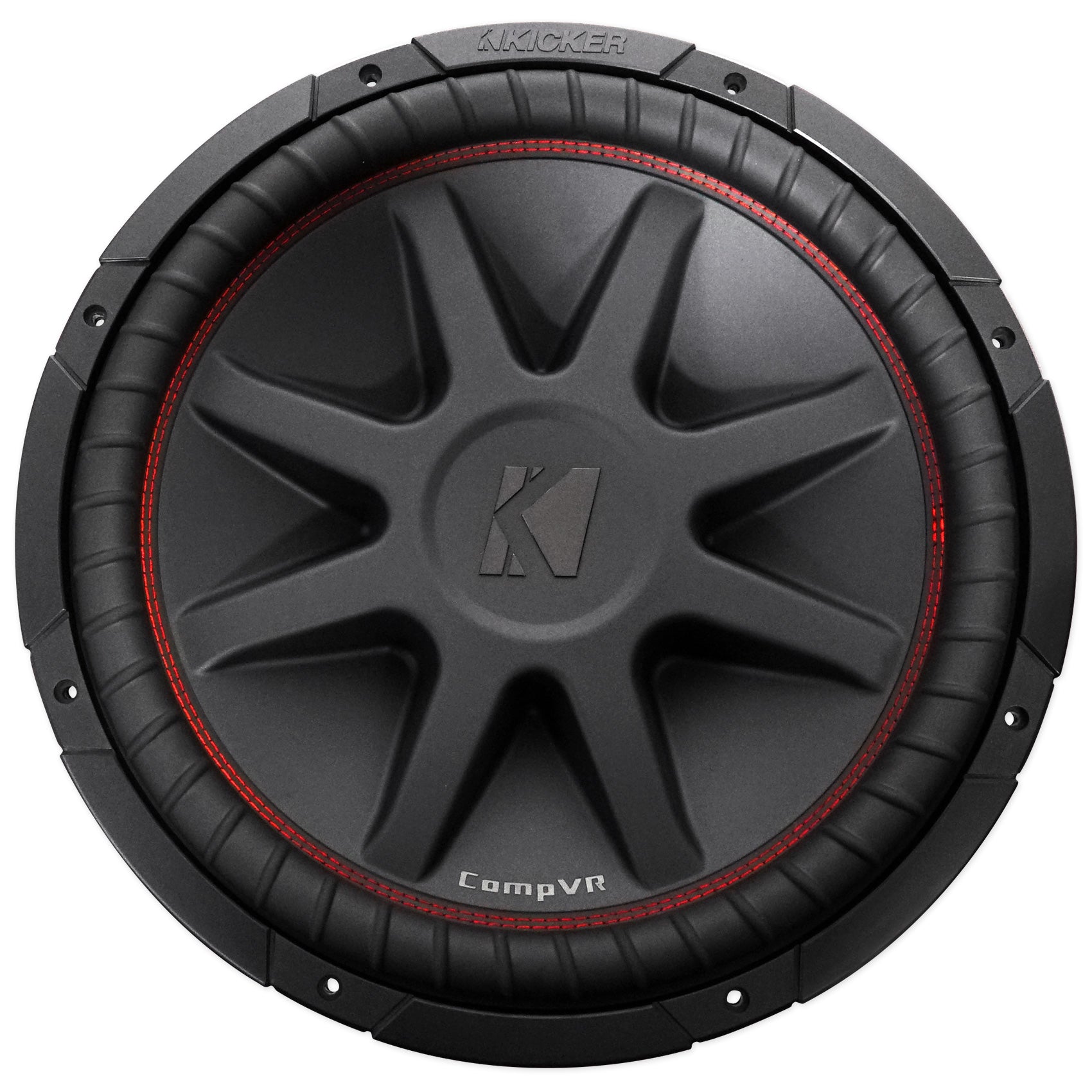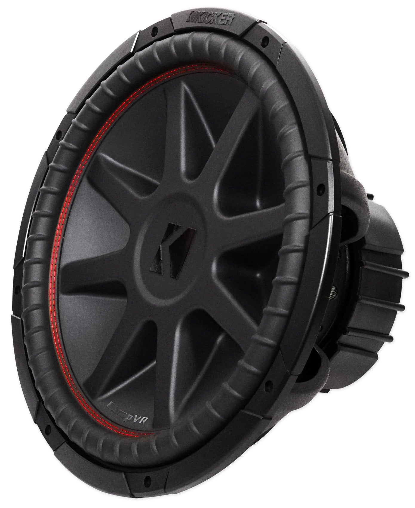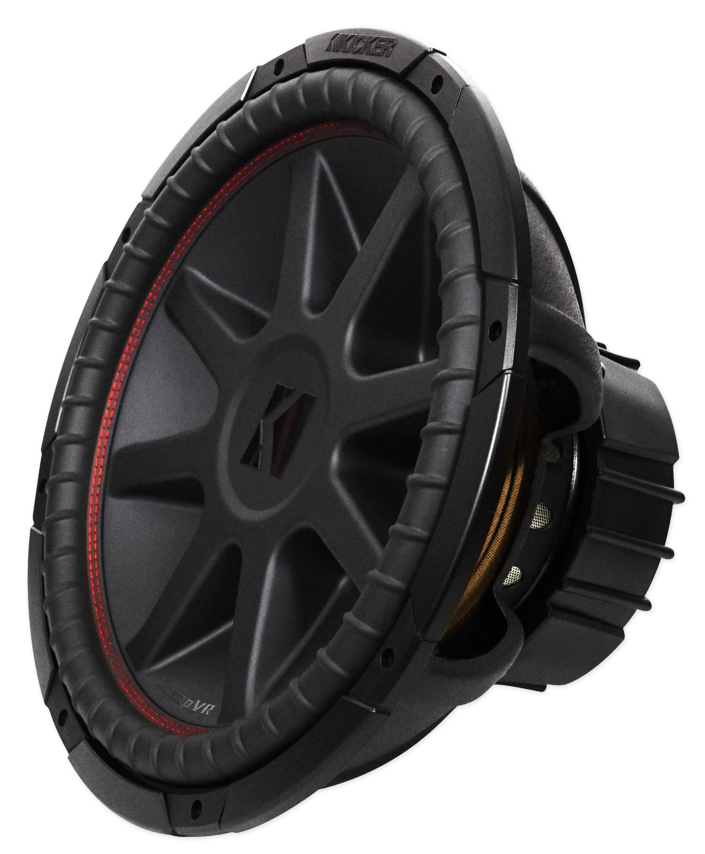 To get the most out of your amp, CompVR comes in two or four-ohm dual voice coils. Kicker red surround stitching binds the suspension perfectly to the cone, while SoloKon™ marries the woofer and back brace into one, cohesive system.