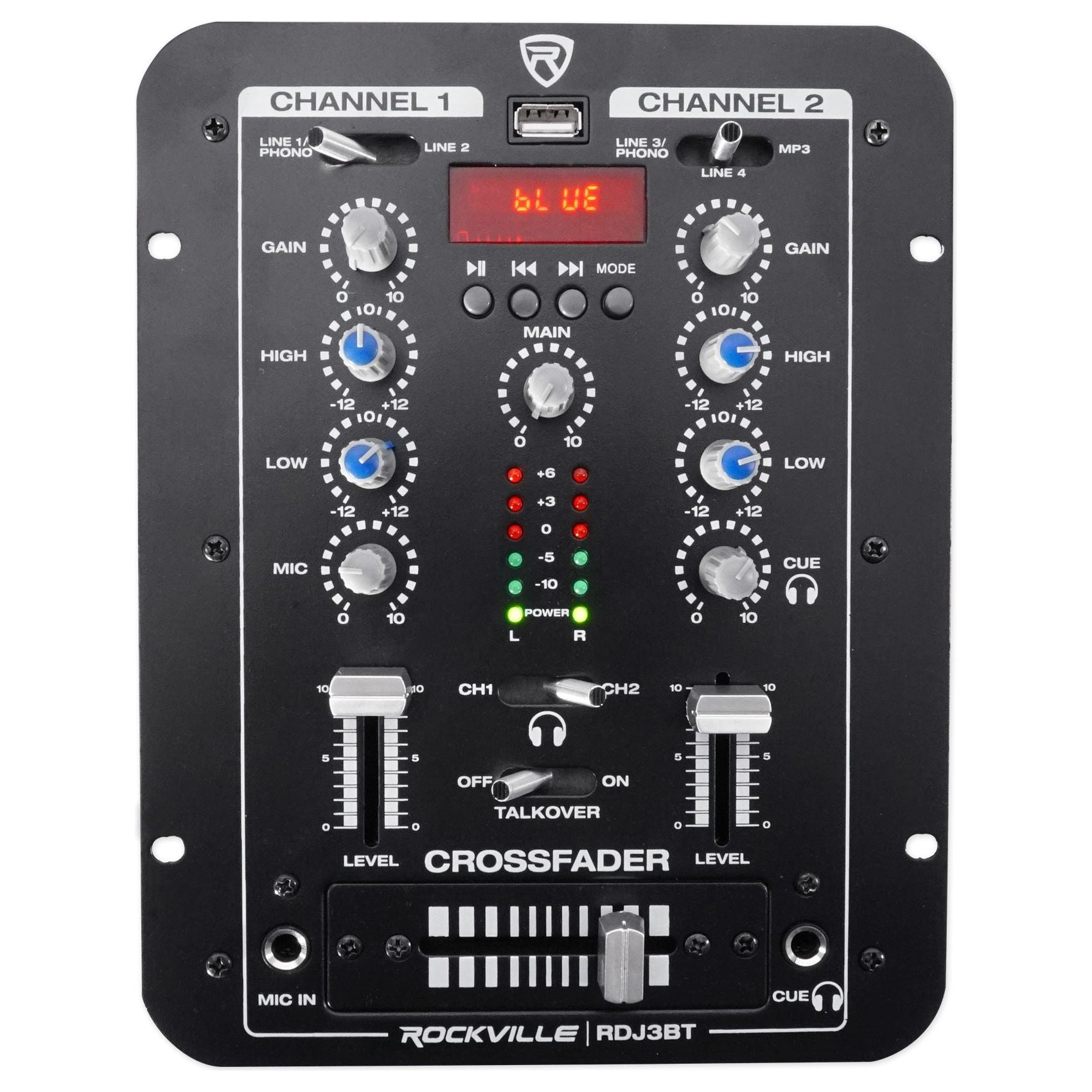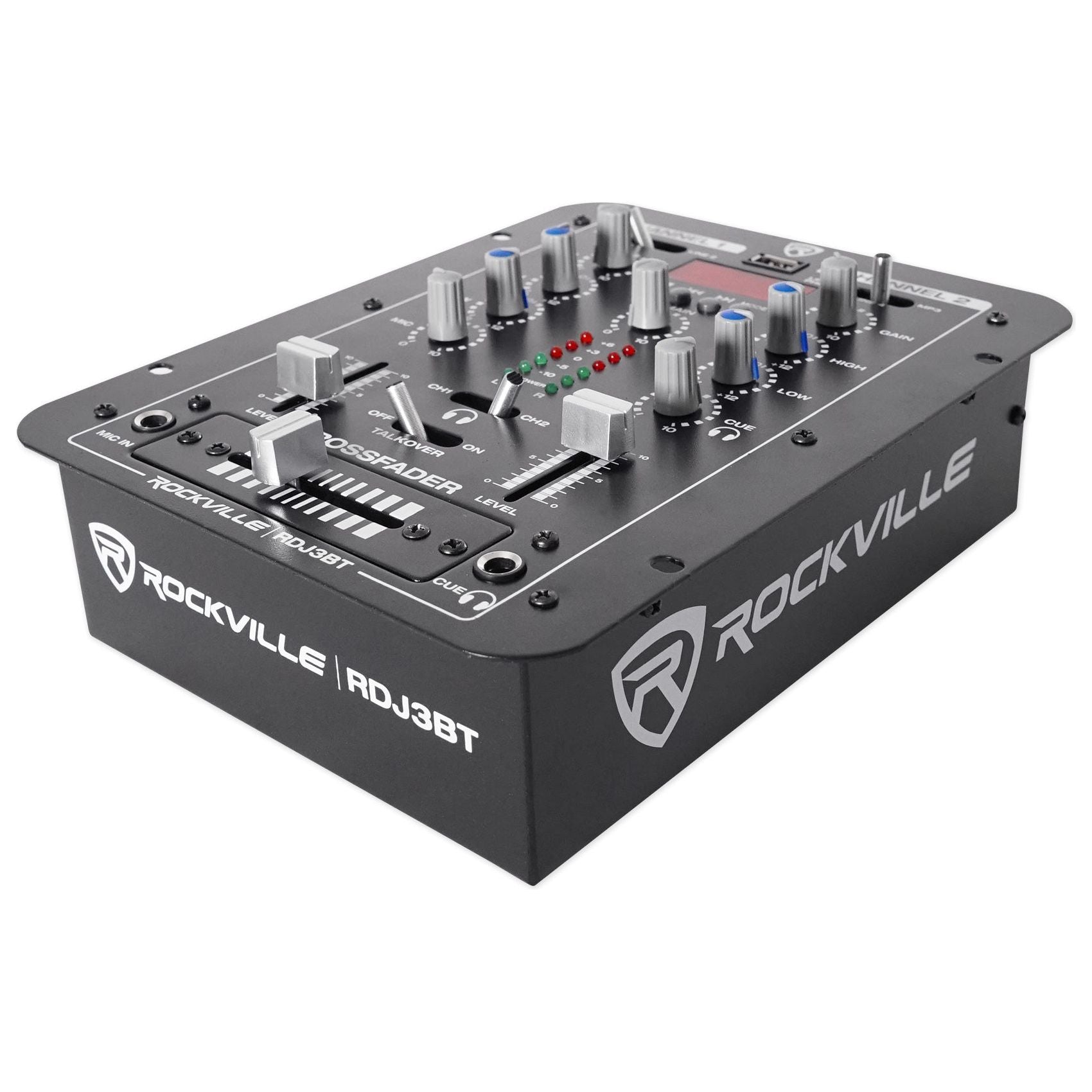 - Rockville RDJ3BT compact 2 channel DJ mixer with USB, Bluetooth, and LED display