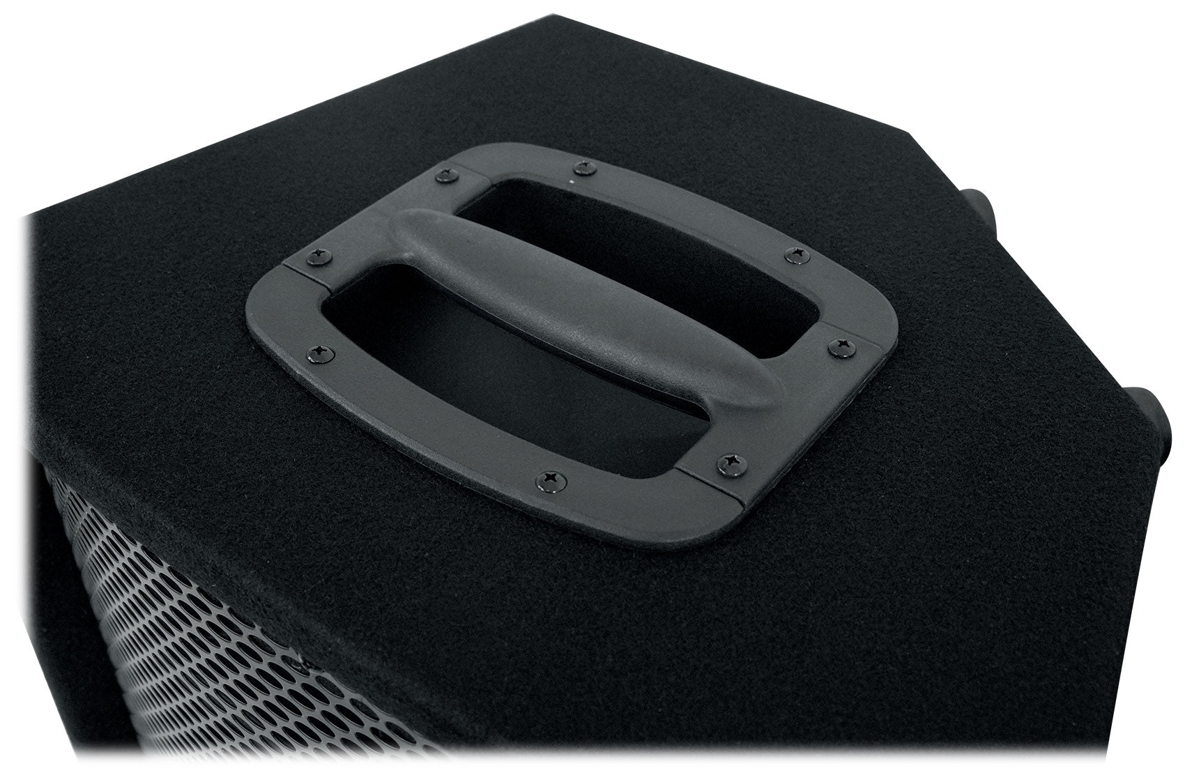 - Enclosure materials and finish: Trapezoidal, black carpet covered enclosure and a full length black