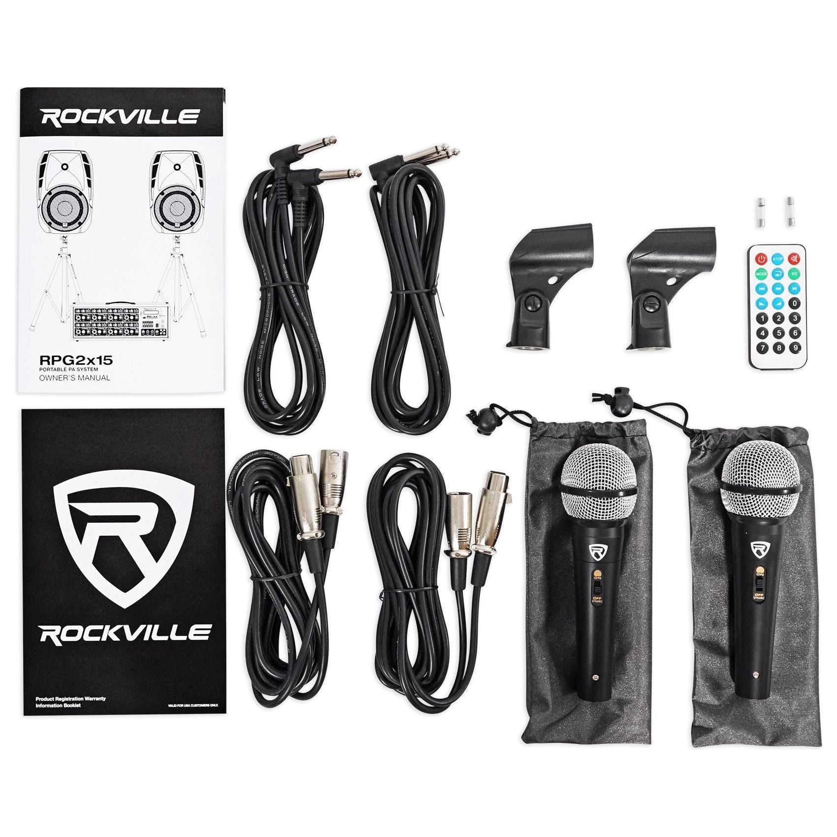 - (1) Rockville RPG2X15 Package PA System Mixer/Amp+15" Speakers+Stands+Mics+Bluetooth